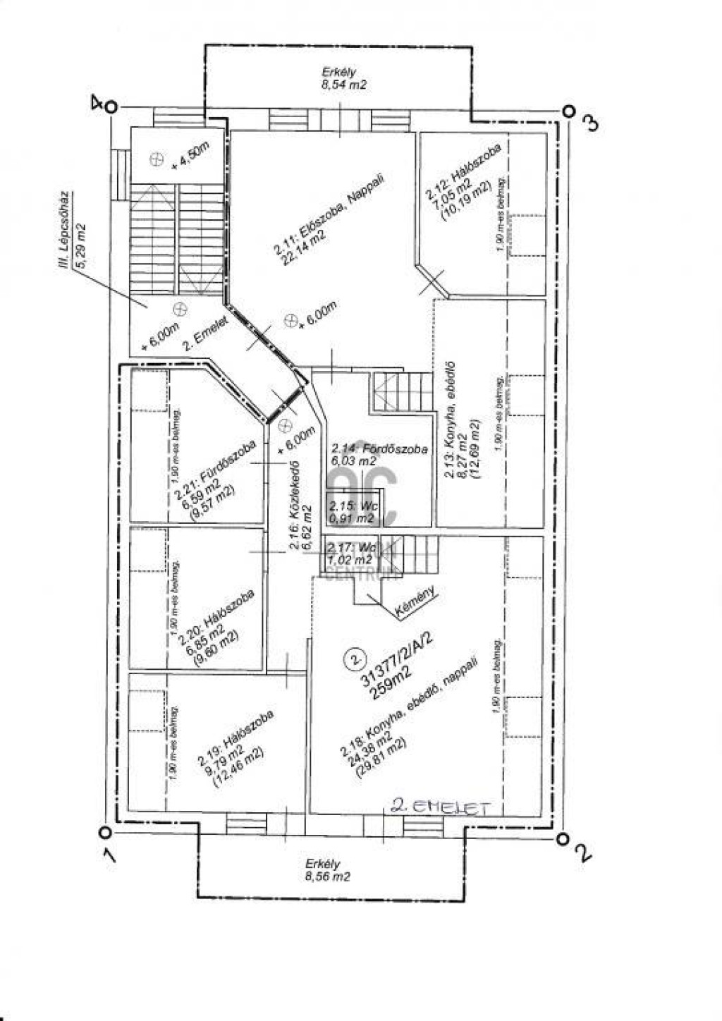 -második emelet: netto 1 21.96nm, itt már a tető döntött síkja miatt kevesebb a tényleges négyzetméternél