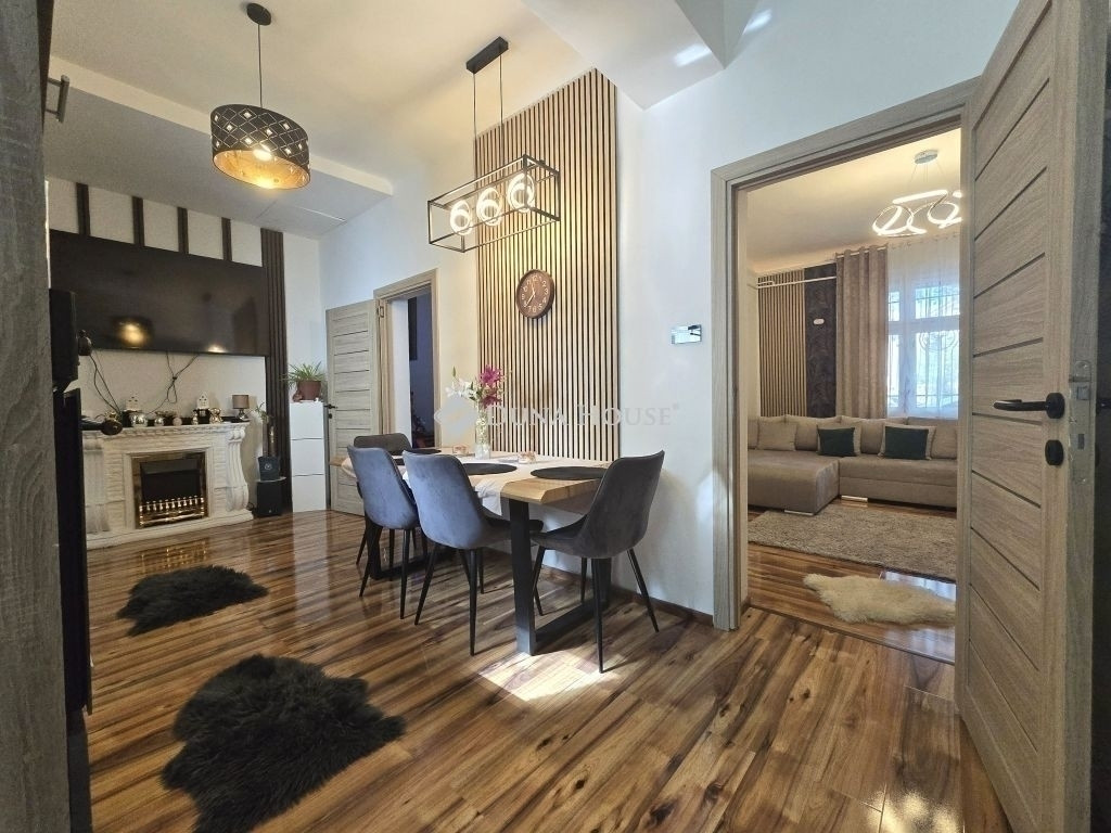 Teljesen felújított, modern családi ház Kispest kertvárosi részén hangulatos kerttel, kerti sütögetővel és kiváló közlekedéssel!Eladásra kínálunk egy igényesen, teljes körűen felújított, 68 m²-es, 3 szobás, téglaépítésű családi házat Kispest kertvárosi, csendes és rendezett utcájában, 348 m²-es saját telekkel!A ház minden részlete minőségi megoldásokat tükröz; új konyha, új fürdőszoba, modern érintőkapcsolók, klimatizált helyiségek, és esztétikus, jól kihasználható terek jellemzik.A felújítás során nemcsak a technikai elemek (vezetékek, burkolatok, gépészet), hanem a belső dizájn is új életet kapott az eredmény egy modern, mégis otthonos tér, amely azonnal költözhető állapotú. Főbb jellemzők:- Teljes körű felújítás új villany- és vízhálózat, burkolatok, szaniterek, modern belső kialakítás- Konvektoros fűtés, klíma biztosítja a komfortot egész évben- Műanyag és fa hőszigetelt nyílászárók, a ház külső szigetelést is kapott- Cseréptető újrarakva, részben új lécezéssel és gerendákkal- Érintőkapcsolók minden helyiségben- Tágas, világos helyiségek, sok ablak, jól átgondolt elrendezés- Kovácsoltvas bejárati kapu, igényes, modern kerítéssel- 16 m²-es tároló az udvaron- Hangulatos, külön kialakított kerti sütögető rész természetes kövezettel és díszvilágítássalA ház mögötti közvetlen kert gondozott, műfűves burkolattal ellátott, karbantartásmentes és rendezett megjelenésű, mögötte további füves hátsó kert található tökéletes hely pihenésre, napozásra, gyerekeknek játszótérnek, vagy akár konyhakert, medence kialakítására.Elhelyezkedés, közlekedés, infrastruktúra:A ház Kispest kertvárosi részén található, egy nyugodt, családi házas utcában, ahol barátságos lakóközösség és rendezett környezet jellemző.A környék biztonságos, csendes, ideális választás családoknak, fiatal pároknak vagy bárkinek, aki a városi élet kényelmét, de a kertváros nyugalmát keresi.Közlekedés:A KőbányaKispest (M3 metró, vasút, buszvégállomás) mindössze néhány percre elérhető.Számos buszjárat ( 54,55, 68, 194,194B, 268, 948, 999 ) biztosít közvetlen összeköttetést a főbb városrészekkel.Autóval néhány perc alatt elérhető az Üllői út és az M5-ös bevezető szakasza is.Infrastruktúra:A közelben minden megtalálható, amire a mindennapokban szükség lehet:iskola, óvoda, gyógyszertár, pékség, élelmiszerbolt, piac, kisebb üzletek és játszótér mind gyalogos távolságon belül.A nagyobb bevásárlásokhoz a Shopmark, és a KÖKI Terminál is autóval és tömegközlekedéssel is gyorsan megközelíthető.Ez az ingatlan igazi ritkaság Kispest kertvárosi részén, egy teljesen felújított, modern, mégis hangulatos családi ház, tágas kerttel, kiváló közlekedéssel, rendezett utcában, barátságos szomszédsággal.Tökéletes választás azoknak, akik kulcsrakész otthont keresnek, ahol a minőség, a design és a praktikusság tökéletes harmóniában van!Mire vár még? Hívjon, és csapjon le rá, mert nem sokáig lesz a piacon!