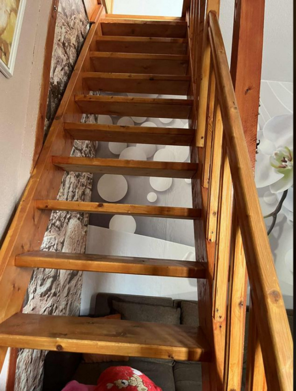 Az emeleten tágas szoba, egy félszoba és erkély van.