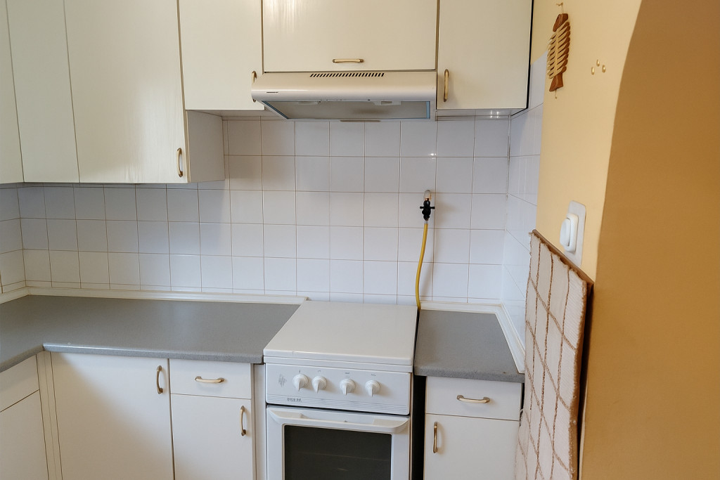 Világos, ablakos konyha gáztűzhellyel, szagelszívóval és kétmedencés mosogatóval