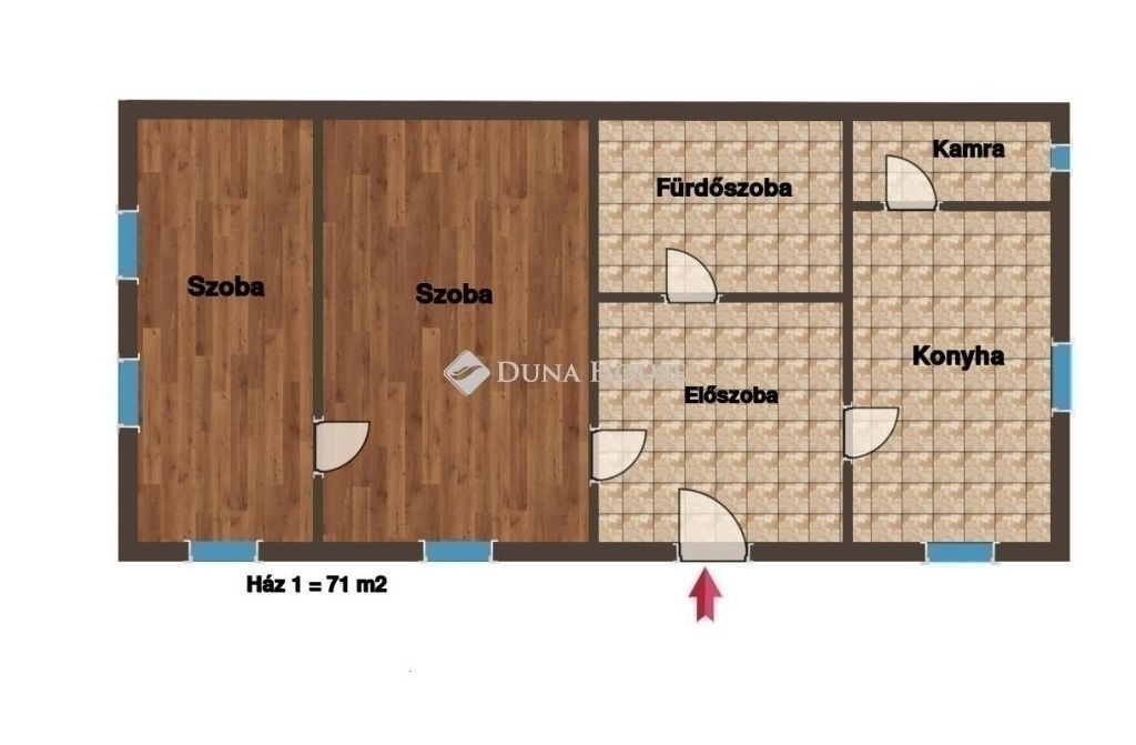 A nagy ház, előkertes, telekhatárra épült, téglaépítésű, cserepes tetőhéjazattal, jó állapotú, szigetelt, 71 mm²-es, 2 szoba, konyha-étkező és fürdőszoba.