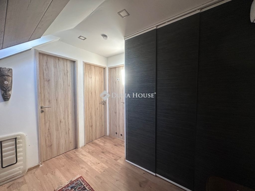 Fent egy széles közlekedőn át, mely gardróbnak remekül funkcionál, két háló félszobák és egy fürdőszoba található.