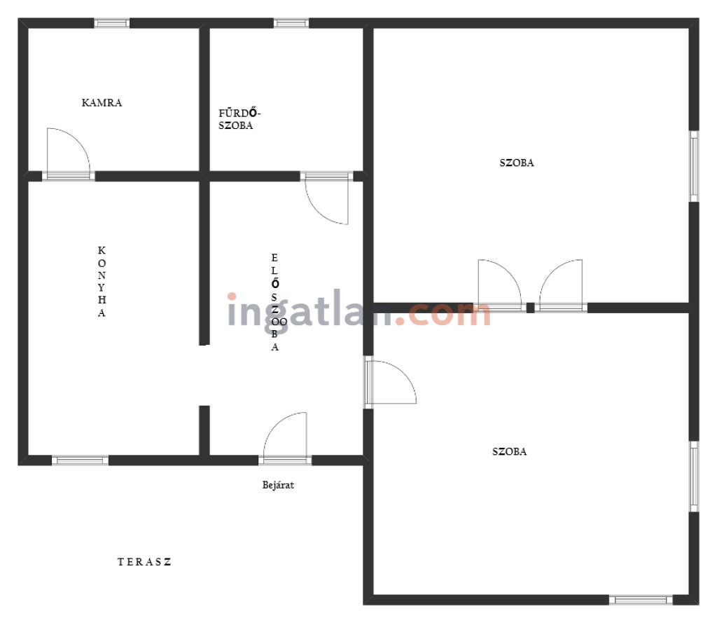 két egybenyíló szoba, ablakos konyha, ablakos fürdőszoba WC-vel, ablakos kamra, előszoba és terasz, fűtés: 3 db elektromos hőtárolós kályha, melegvíz: villanybojler éjszakai árammal