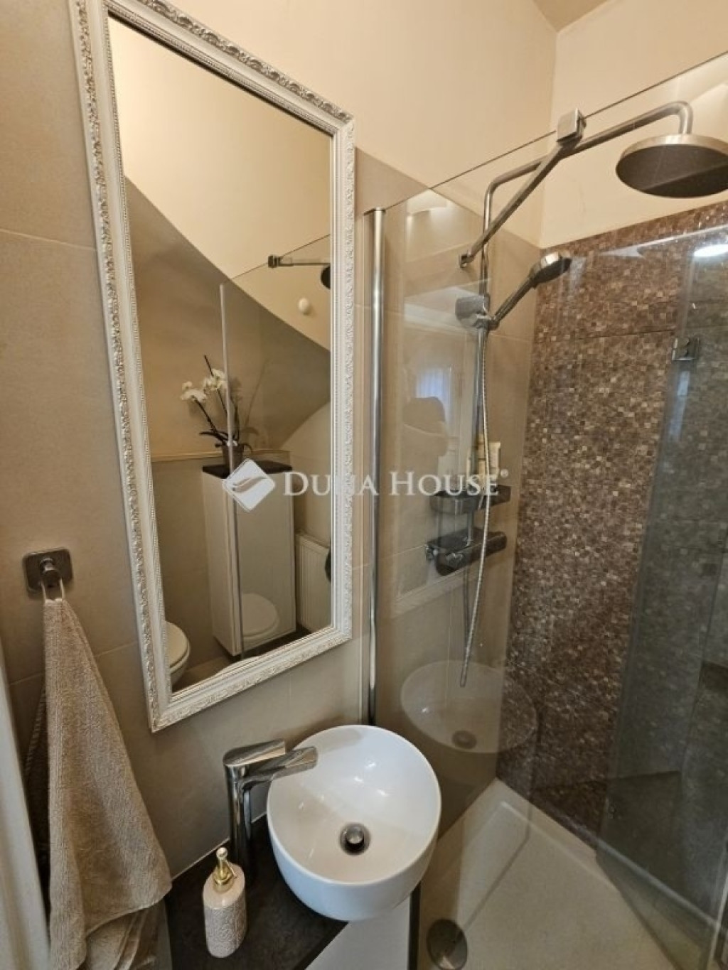 Lent található egy zuhanyzós fürdő és WC. Az emeleten három tágas szoba vár, ebből kettőhöz saját kis erkély tartozik. Gondosan megtervezett fürdőszoba dupla mosdóval és természetes fényt biztosító ablakkal.
