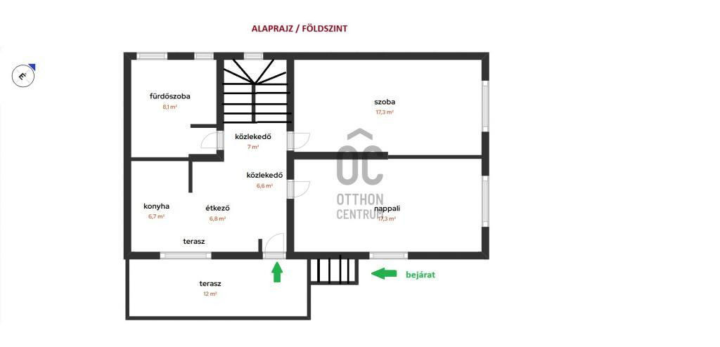 70m2-es a földszint, nagy étkezős konyhával, nappalival, hálóval, kényelmes méretű fürdőszobával.