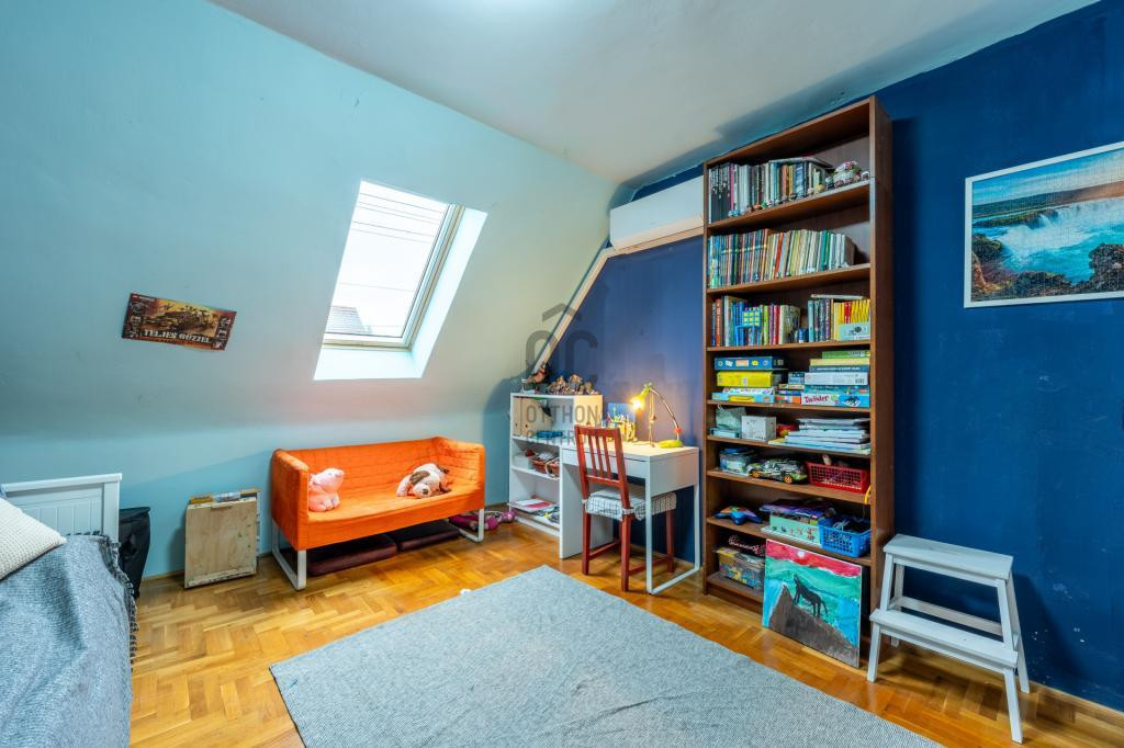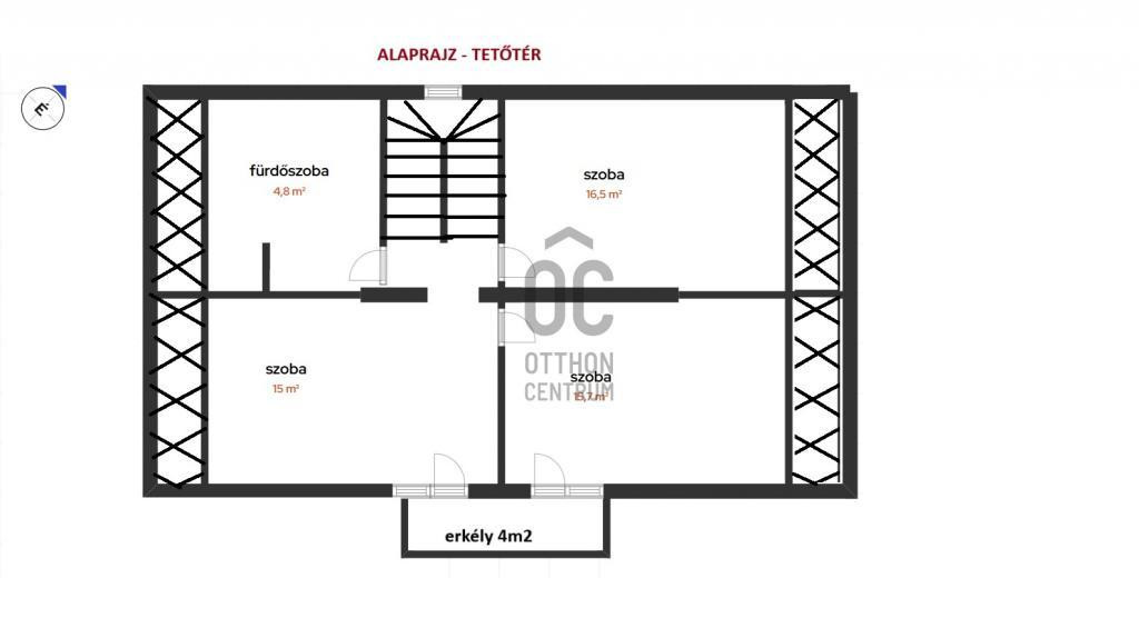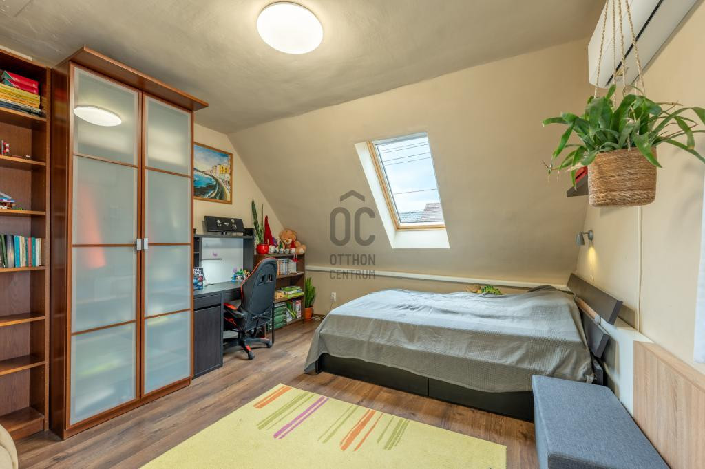 A tetőtér is közel 60m2, ahol 3 szoba és egy fürdőszoba került kialakításra. 2 szobából léphetünk ki az erkélyre.