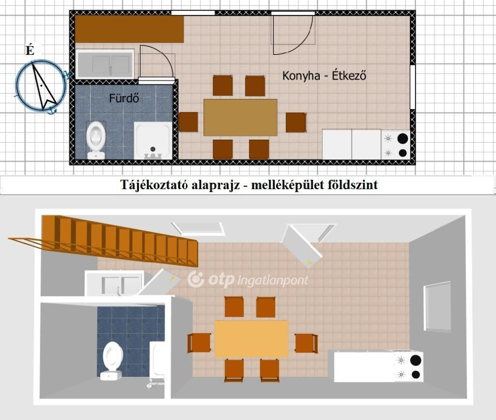 A földszinten amerikai konyhás nappalivá alakítható konyha+étkező, fürdőszoba és WC, az emeleten tágas hálószoba.