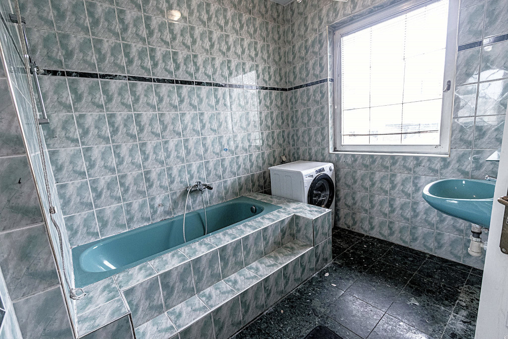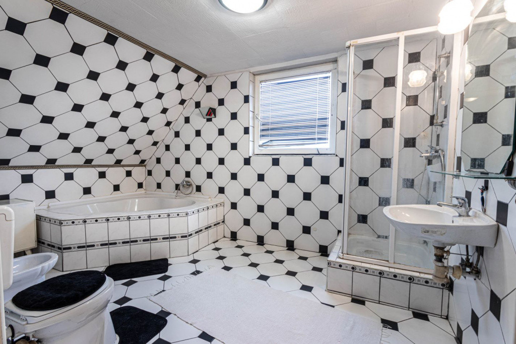 Nagyméretű fürdőszoba: sarokkád, zuhanyzó, WC, bidé, mosdó