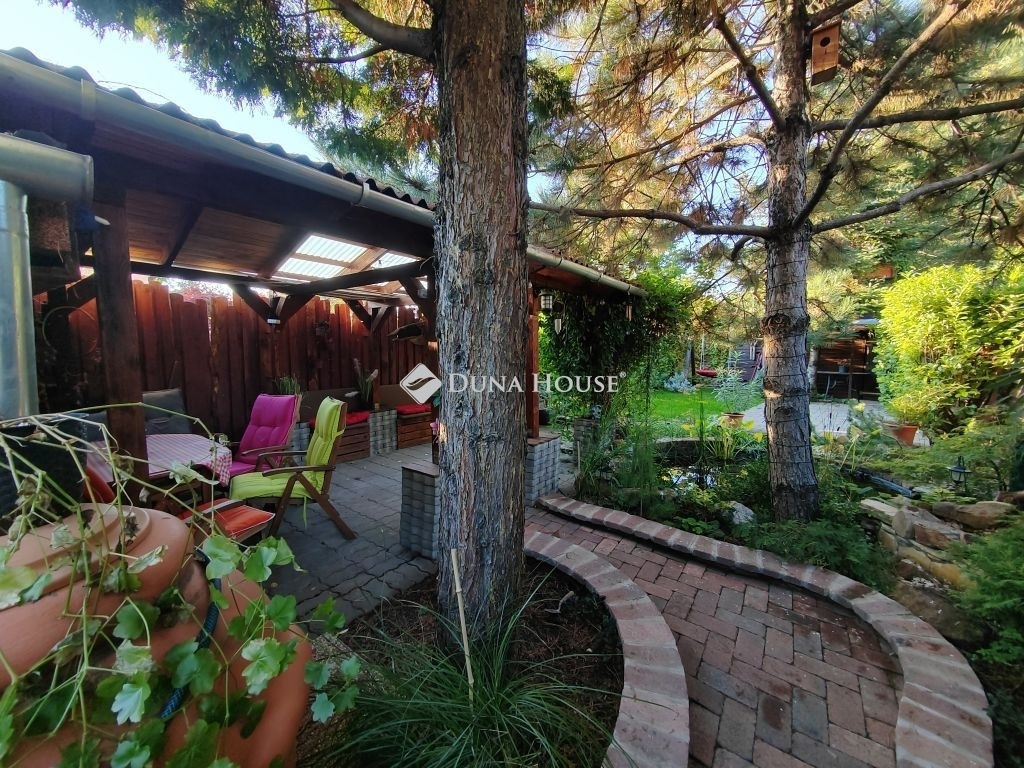 150 nm saját, mediterrán stílusú kert halastóval, sütögetővel, tároló faházzal