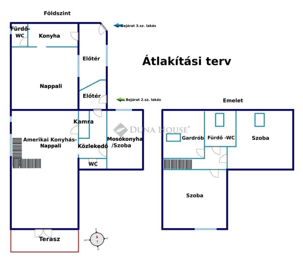 földszint: fedett terasz, amerikai konyhás nappali, étkezős konyha, mosdó