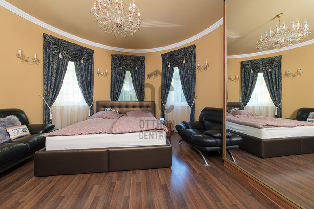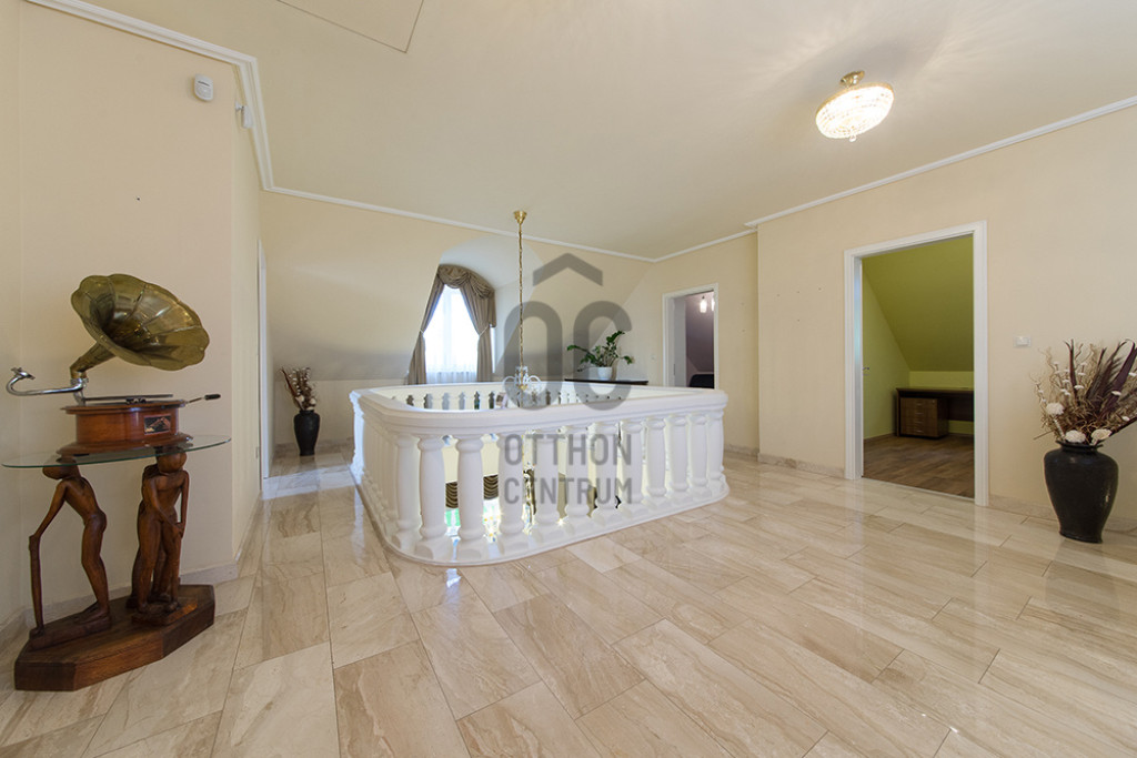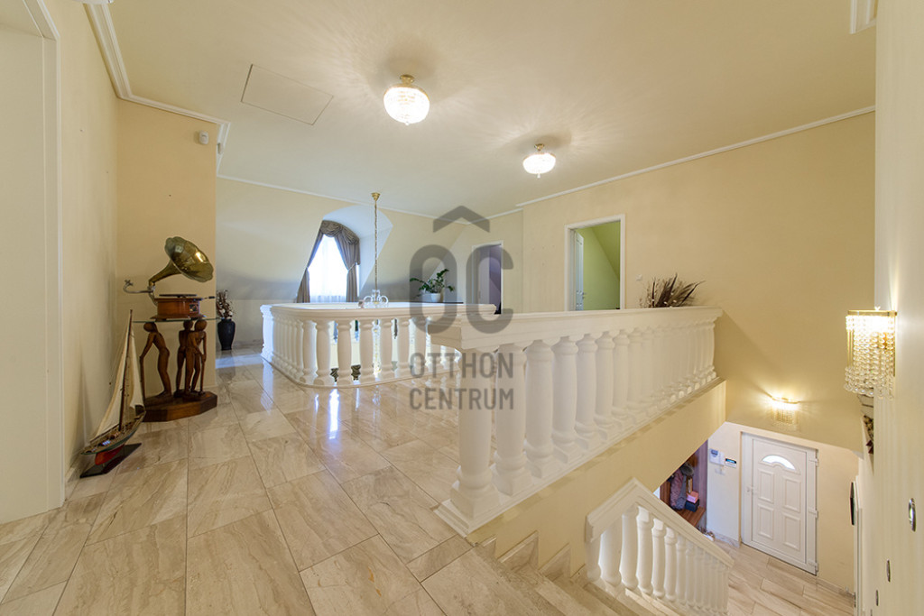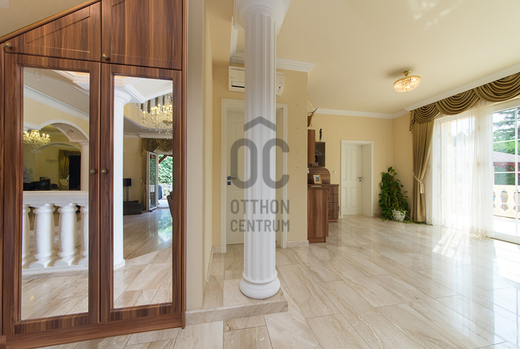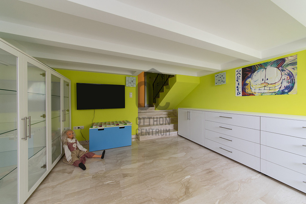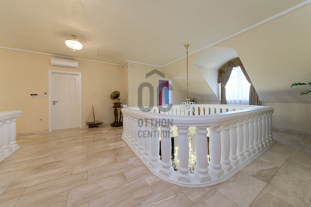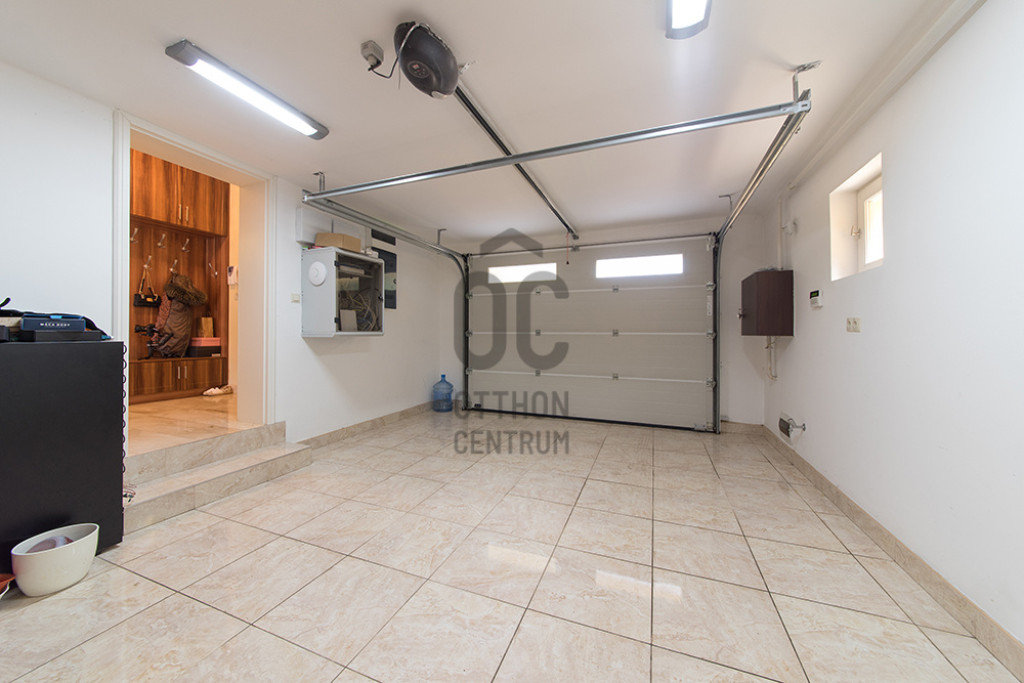 zöld növényekkel kerített, intim telken található, nettó 379 nm. alapterületű, 7 szobás, belső két szintes,
