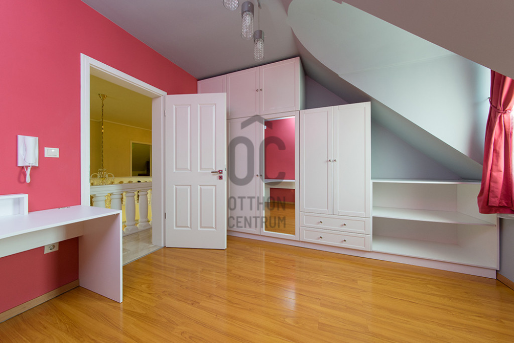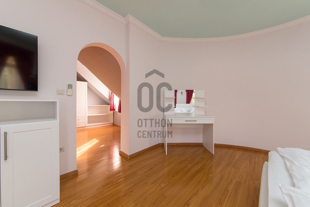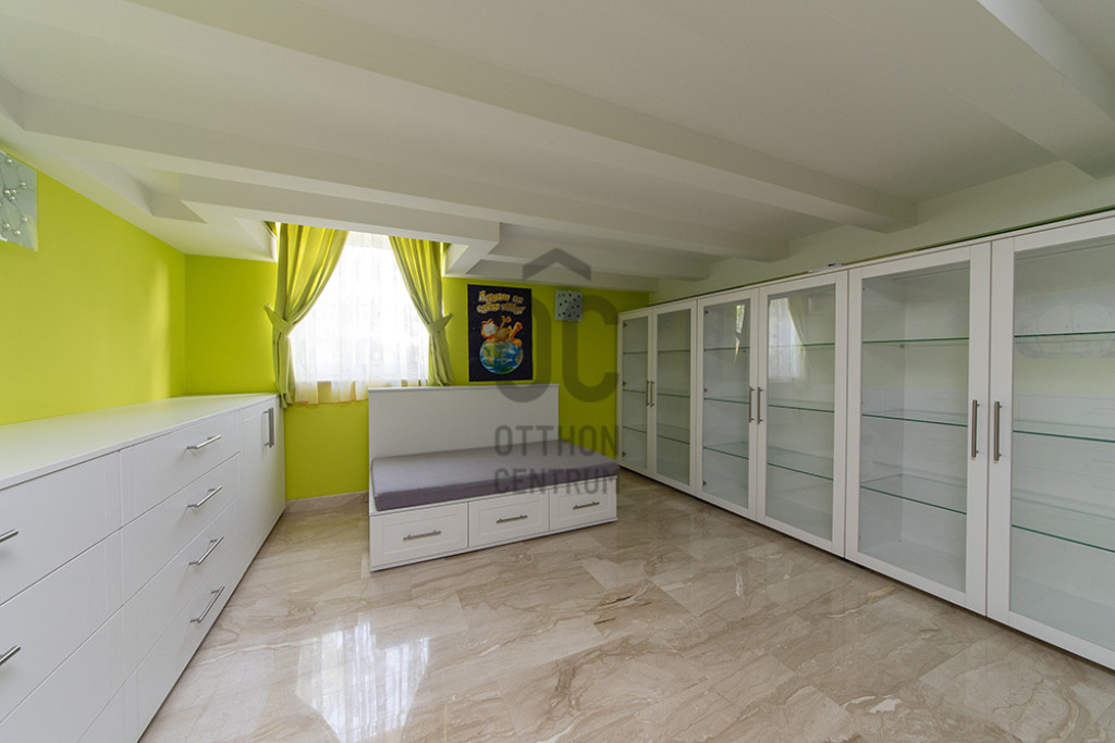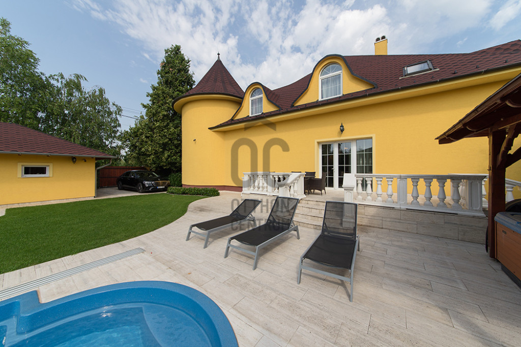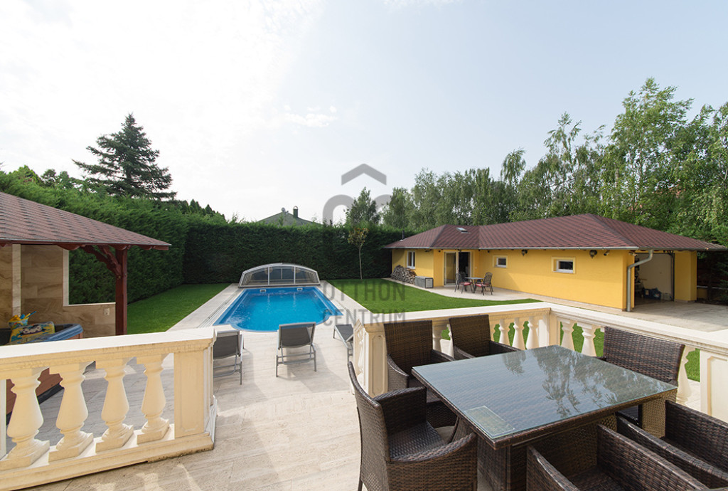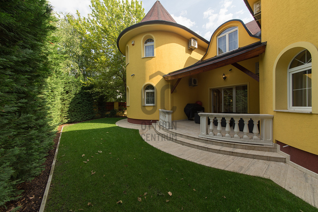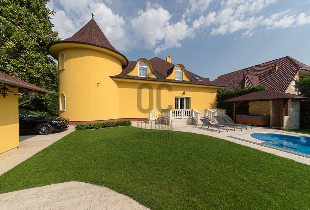 zöld növényekkel kerített, intim telken található, nettó 379 nm. alapterületű, 7 szobás, belső két szintes,