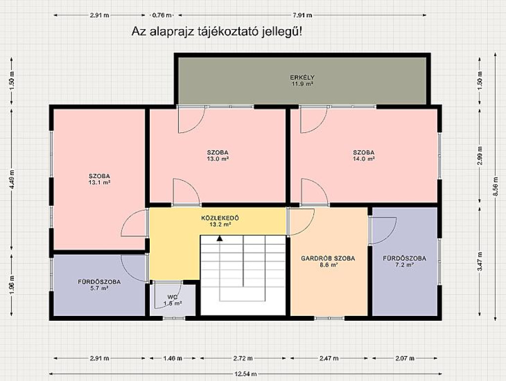 Az emeleten három kényelmes méretű hálószoba került kialakításra, amelyből két szobából kitudunk menni az erkélyre, emellett két tágas fürdőszoba, egy külön gardróbszoba és közlekedő biztosítja a család kényelmét. Az elrendezés ideális akár nagyobb család számára is, hiszen a privát és közös terek harmonikus egyensúlyban vannak.