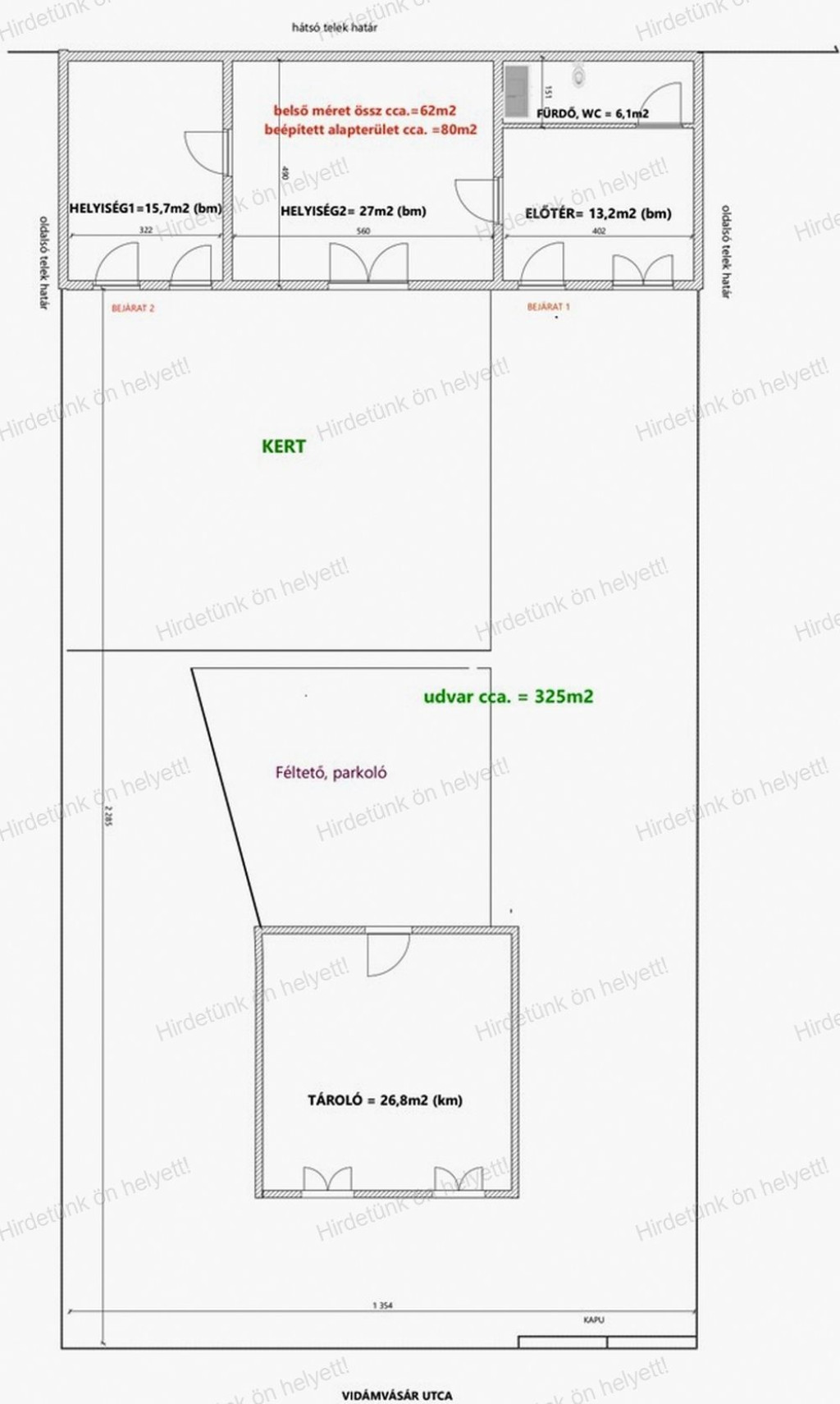 • beépített lakóépületi alapterület kb. 80 m2, lakóterület kb. 62 m2, önálló kb. 325 m2 telekrésszel.