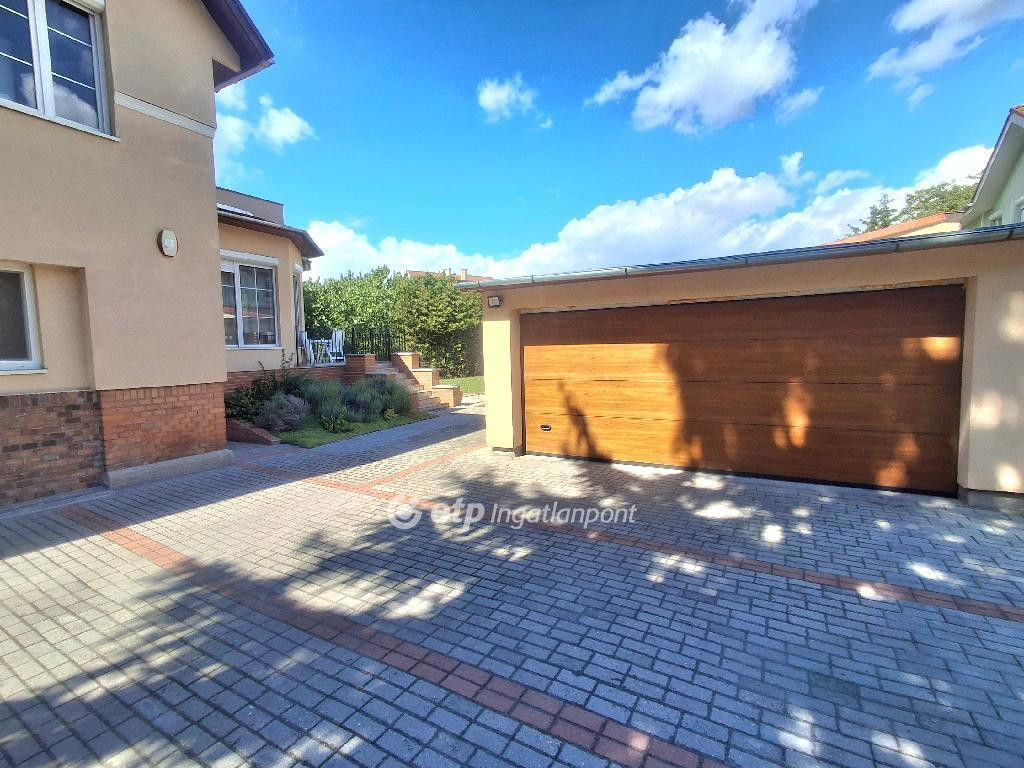 Elektromos kertkapun keresztül van lehetőség beállni a kertbe, ami viacolorral burkolt, és egy 2 állásos , tágas garázs található benne. E mellett még 3 autónak elegendő hely alkalmas a parkolásra. A garázs mellett még egy tároló is áll, ami akár a kerti szerszámok tárolására is alkalmas lehet.