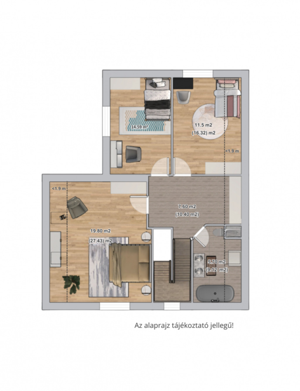Az emeleten 3 különnyíló szoba és a tágas káddal felszerelt fürdőszoba található.