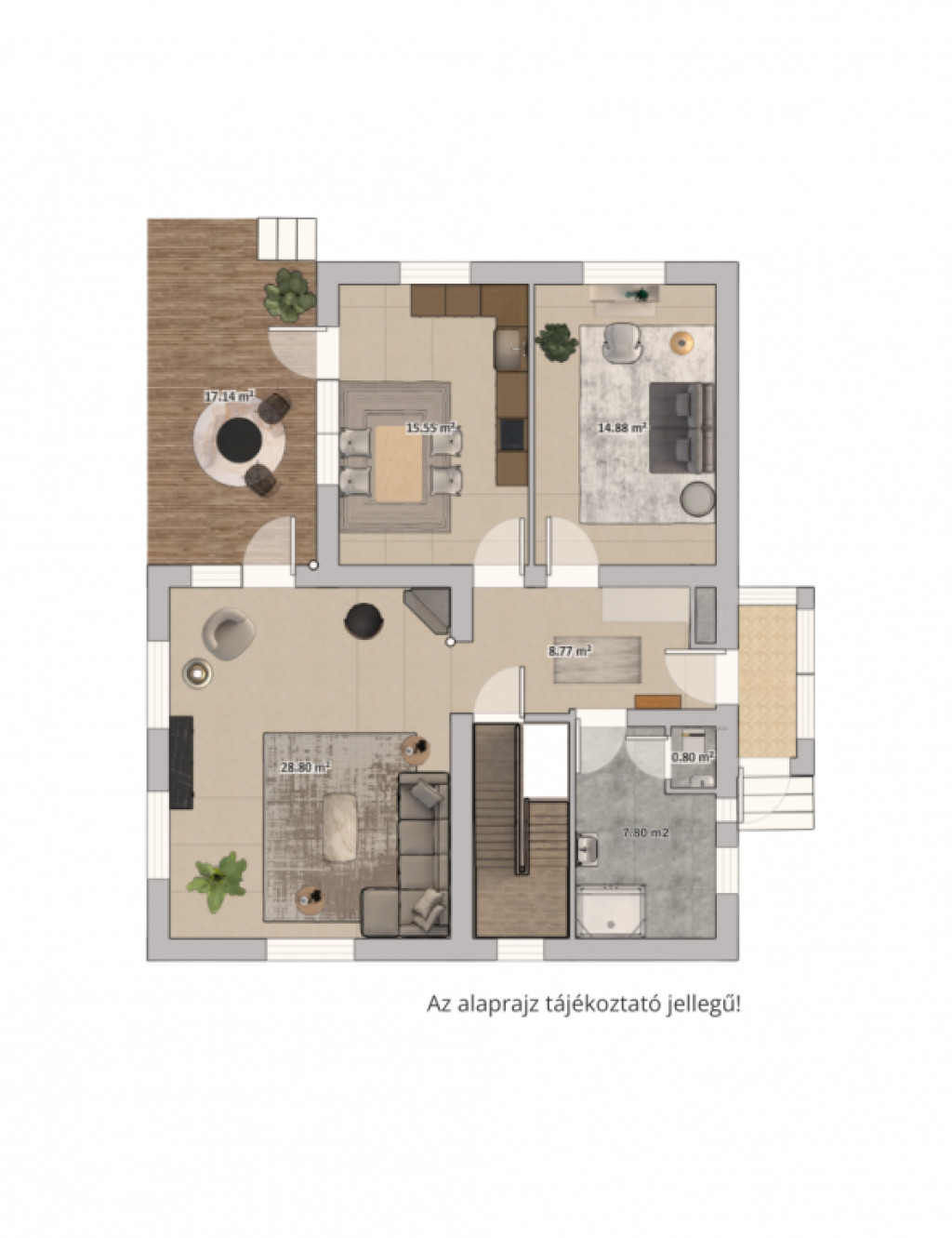 A felső két szintes lakótér (a tetőtéri részekkel együtt 154 m², anélkül 135,8 m²) .
