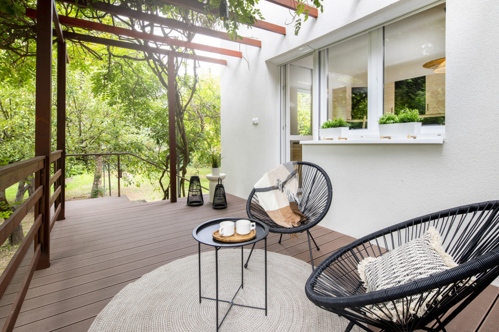 A földszinten található a világos, tágas nappali , az új bútorokkal felszerelt, gépesitett konyha , valamint egy vendégszoba és a zuhanyzós fürdőszoba toalettel.A nappaliból és a konyhából a tágas, hangulatos teraszra és innen a gyümölcsfás kertbe juthatunk,