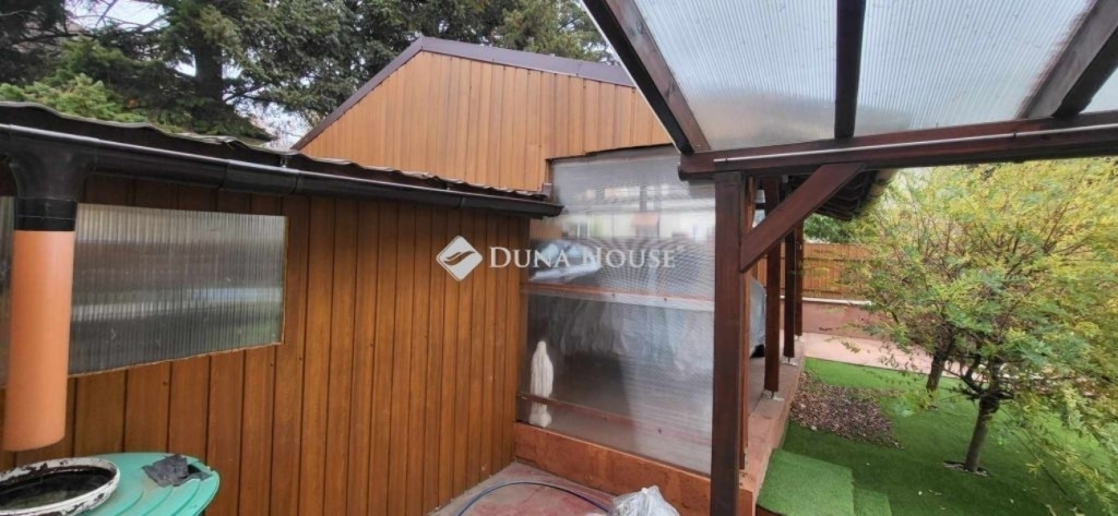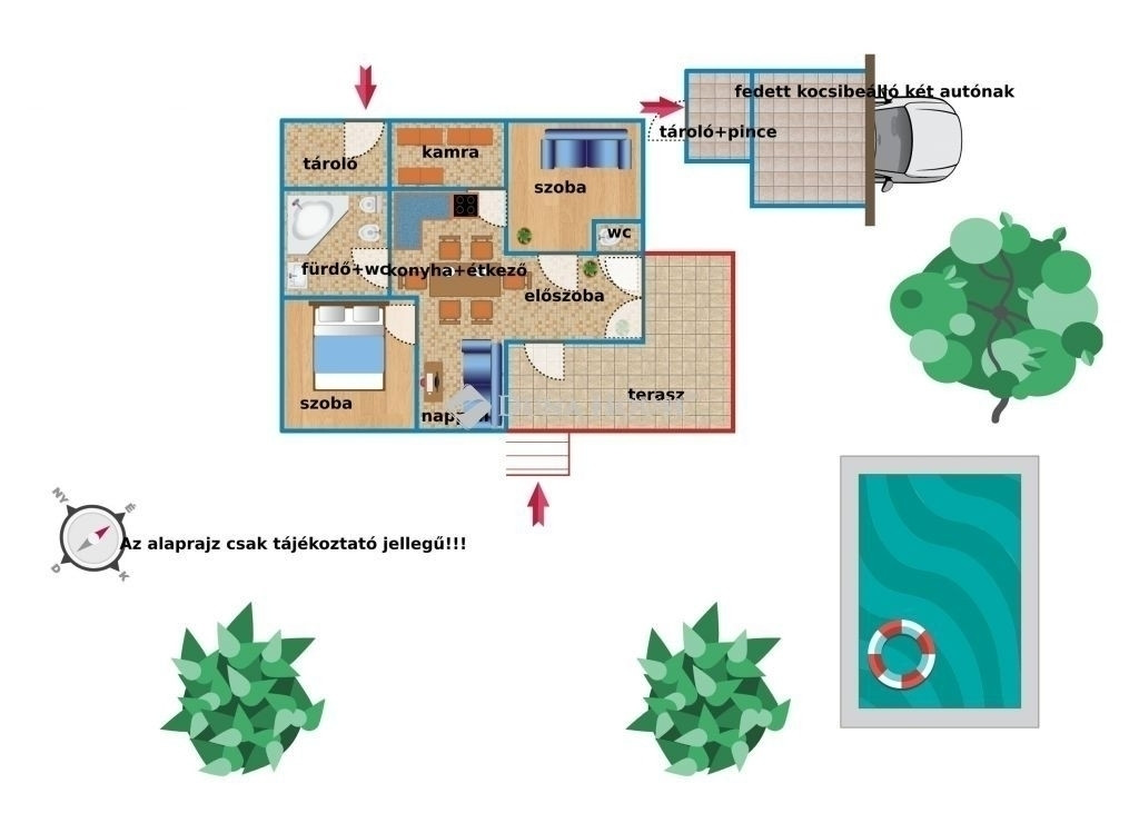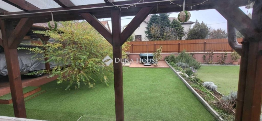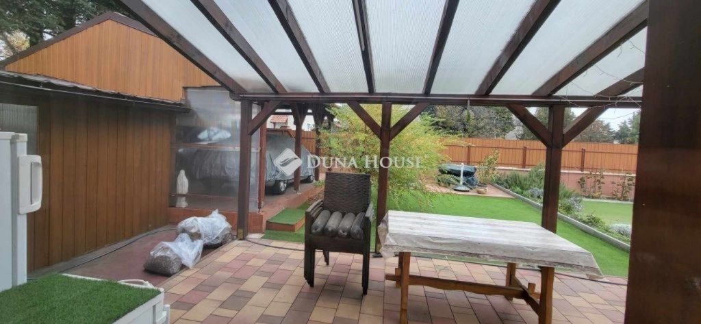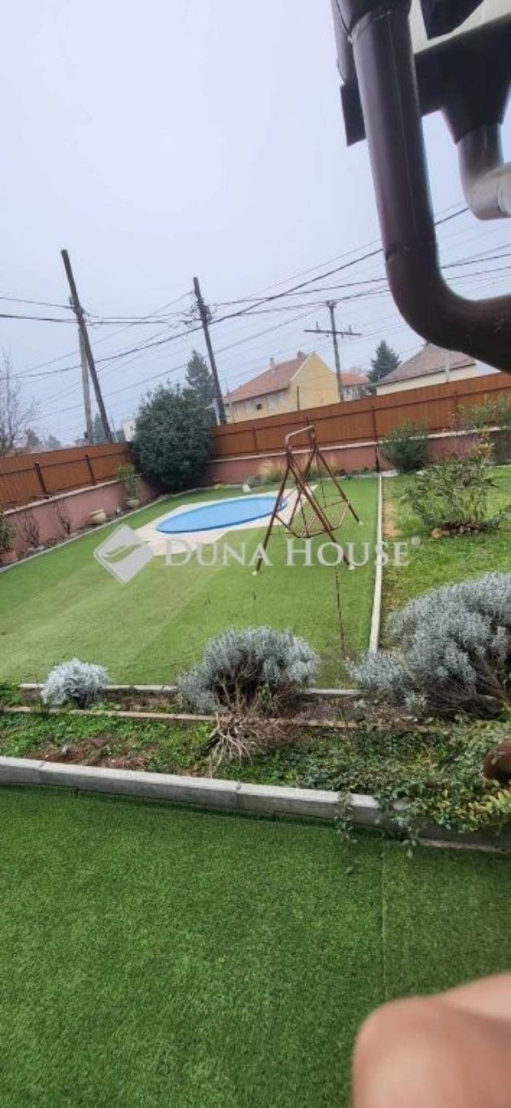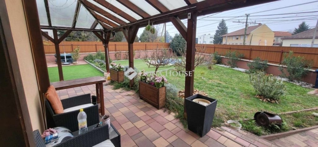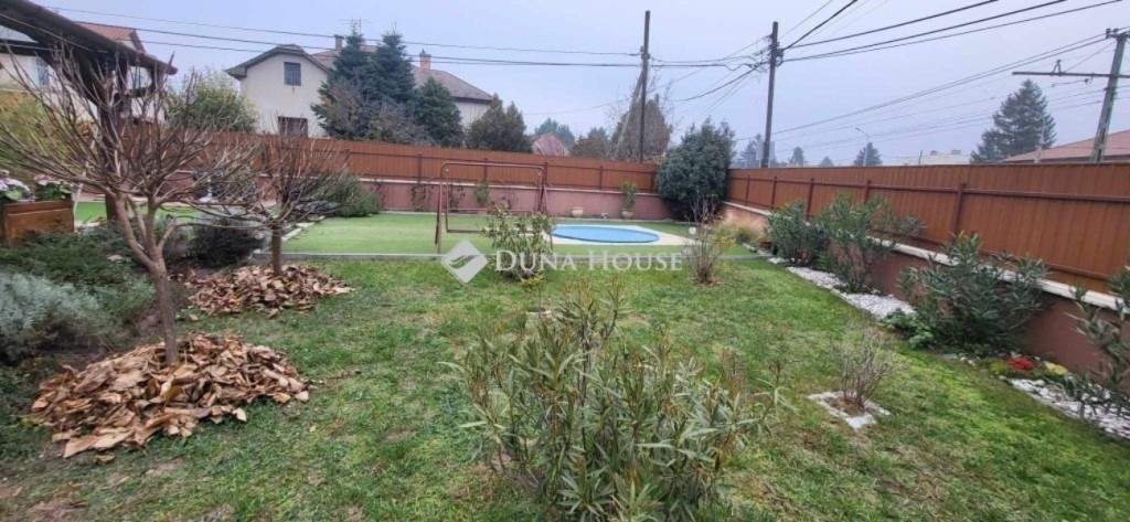 Hatalmas sarok kertjében gyönyörű terasz, medence, két beállós kocsibeálló, udvari tároló is helyet kapott.