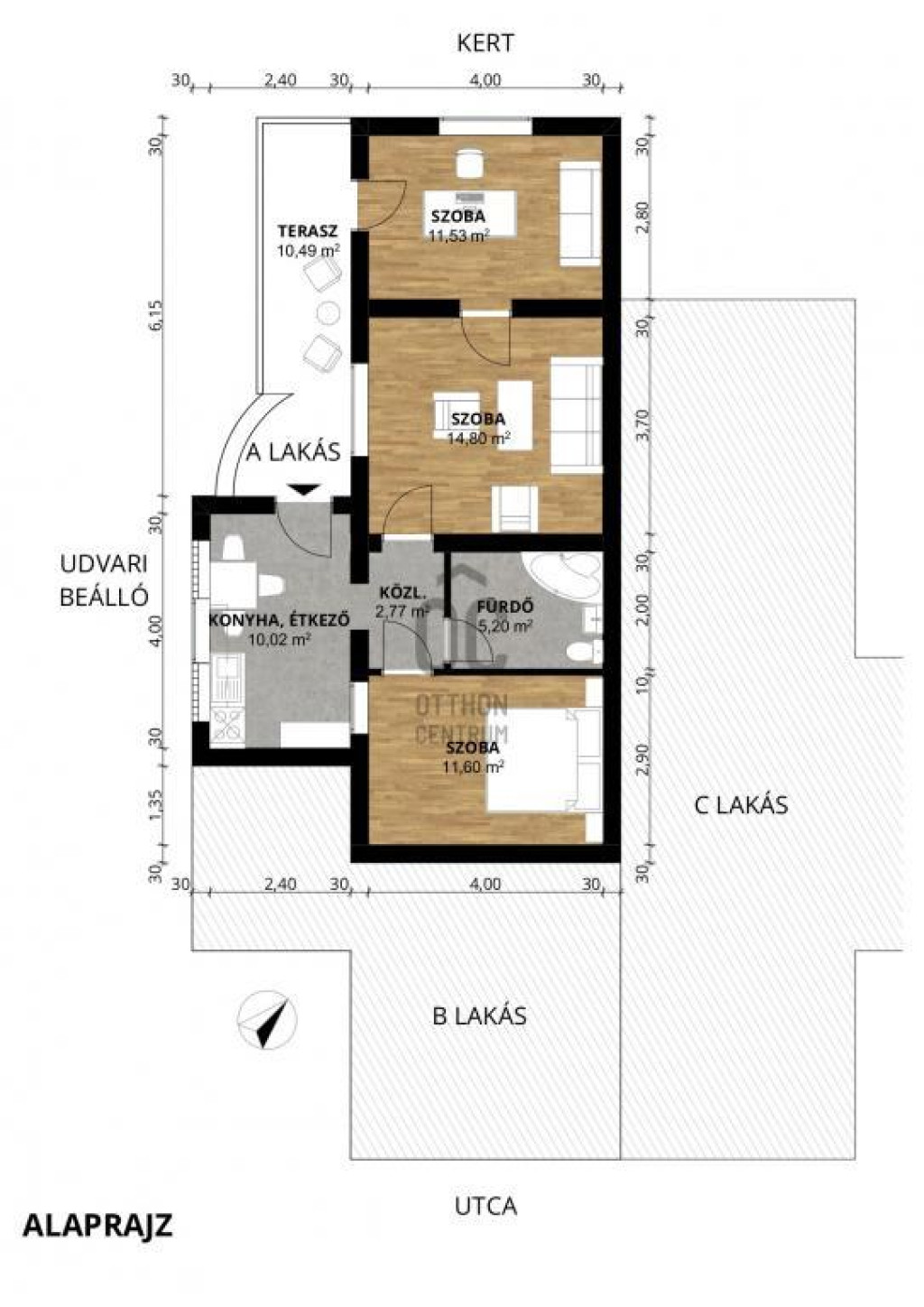 A lakáshoz teljesen önálló, 400 nm-es szeparált kert tartozik
