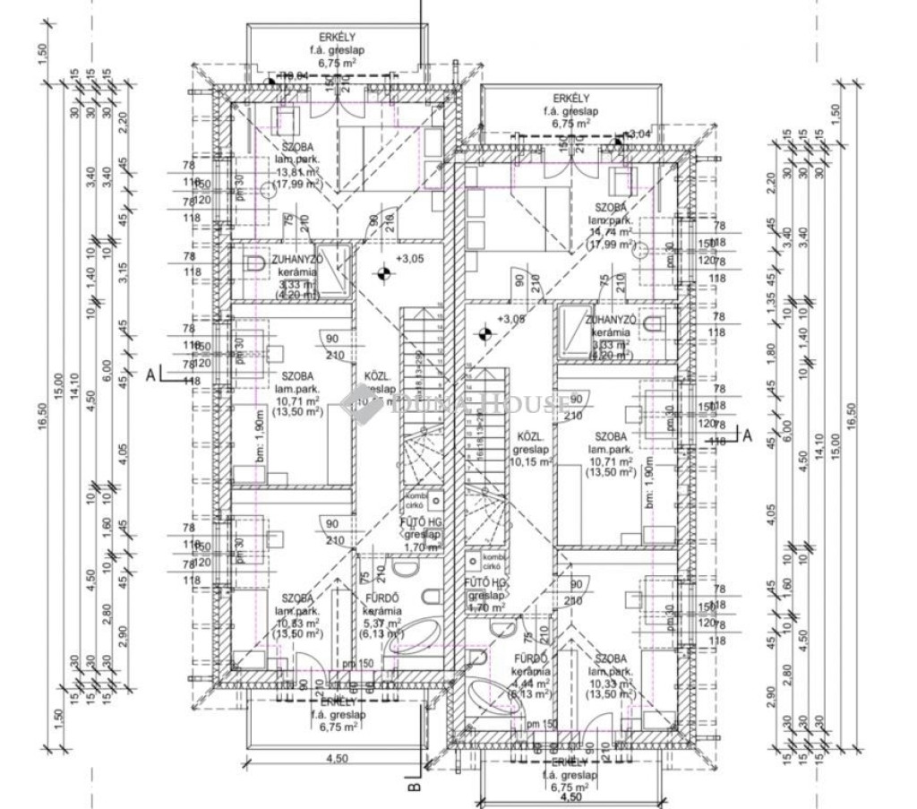A fűtésről ARISTON kondenzációs kazán gondoskodik. Alul és felül padlófűtés + a felső részben radiátor is van.