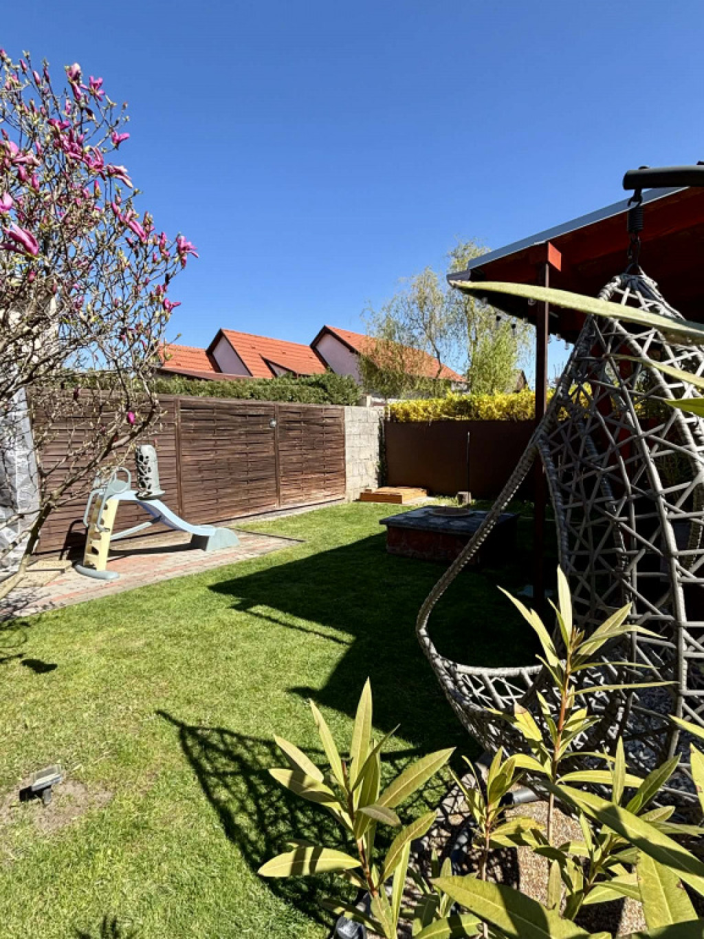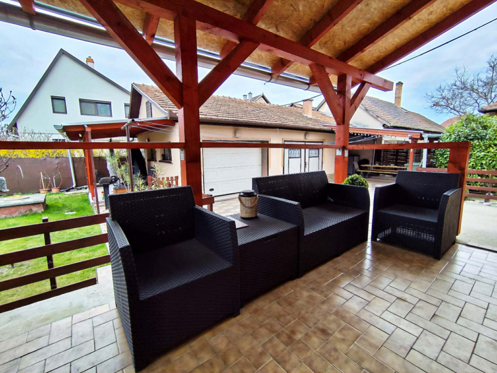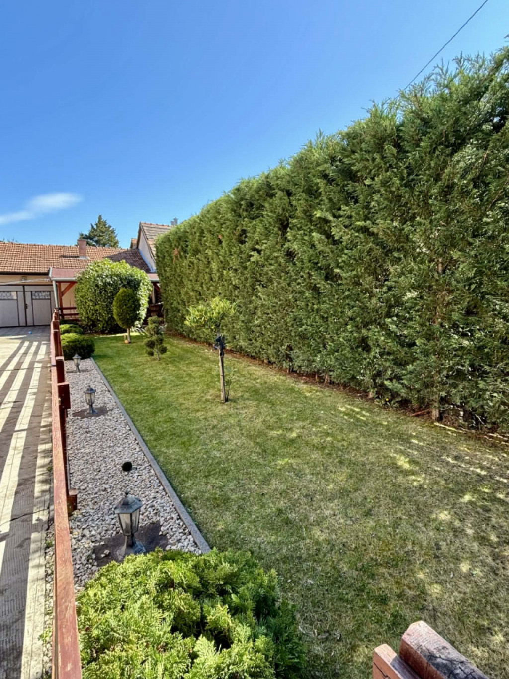 Az 557 nm-es - locsolórendszerrel ellátott kertben - több pihenésre alkalmas terasz, 2 szerelőaknás garázs és egy fedett kocsibeálló is található.