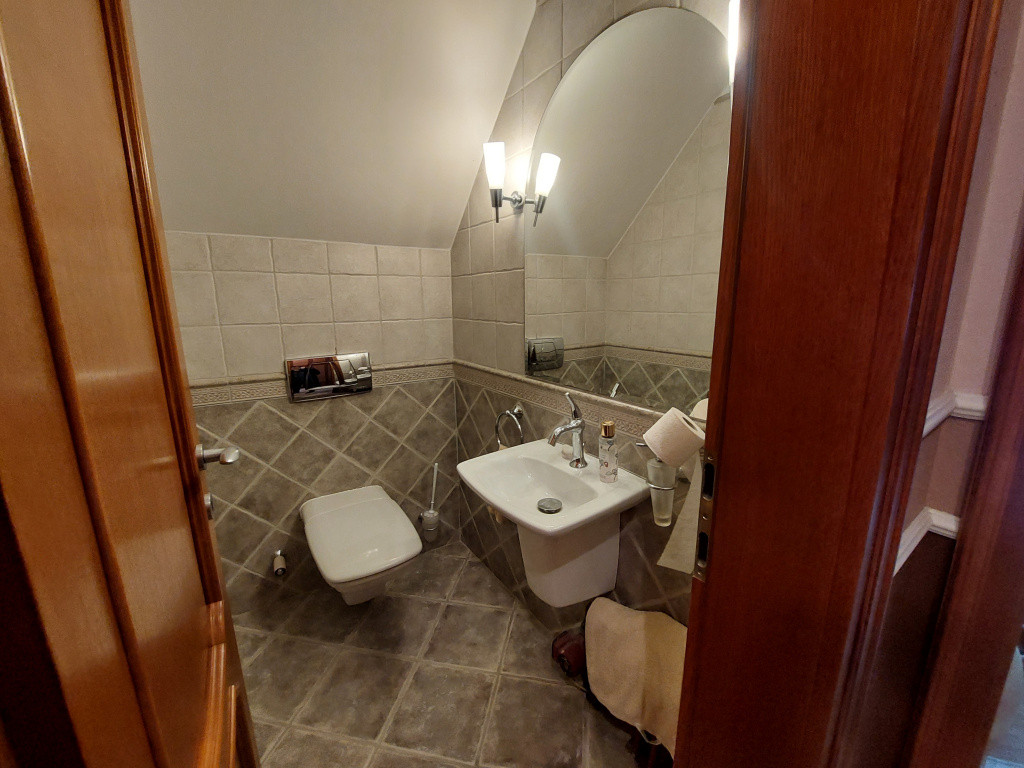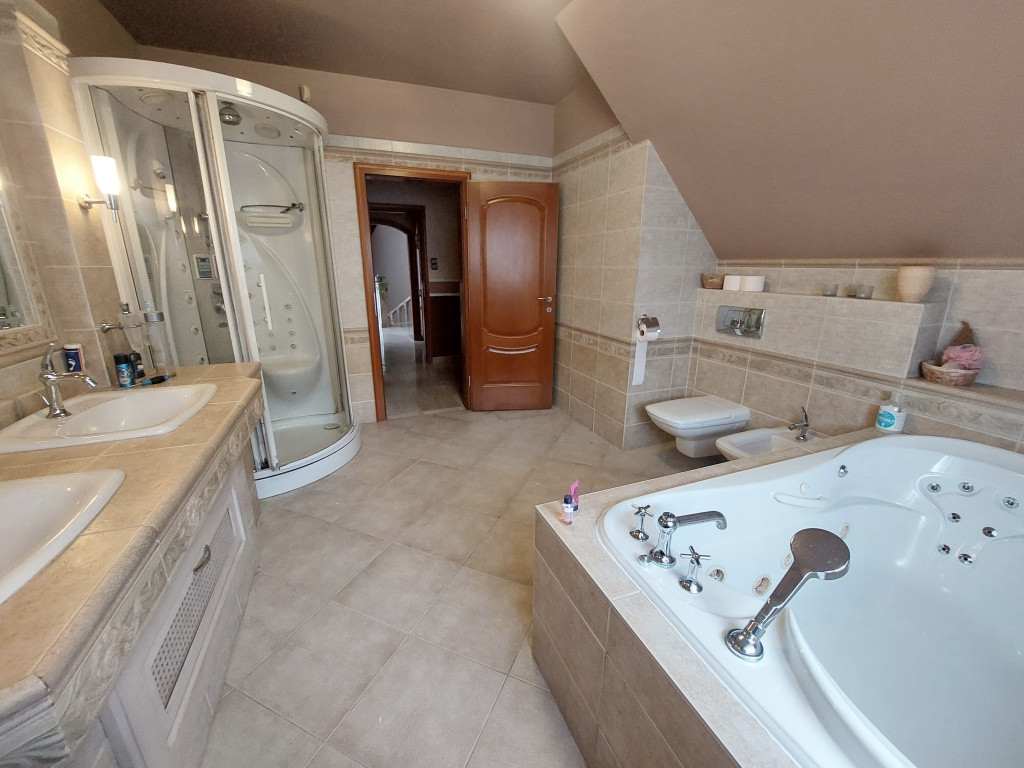 Összességében 1 amerikai konyhás nappali, 4 hálószoba, 2 fürdő, 3 külön WC, wellness részleg, mosókonyha, 3 állásos garázs, valamint közlekedők, gardróbok és tárolók találhatók az épületben.