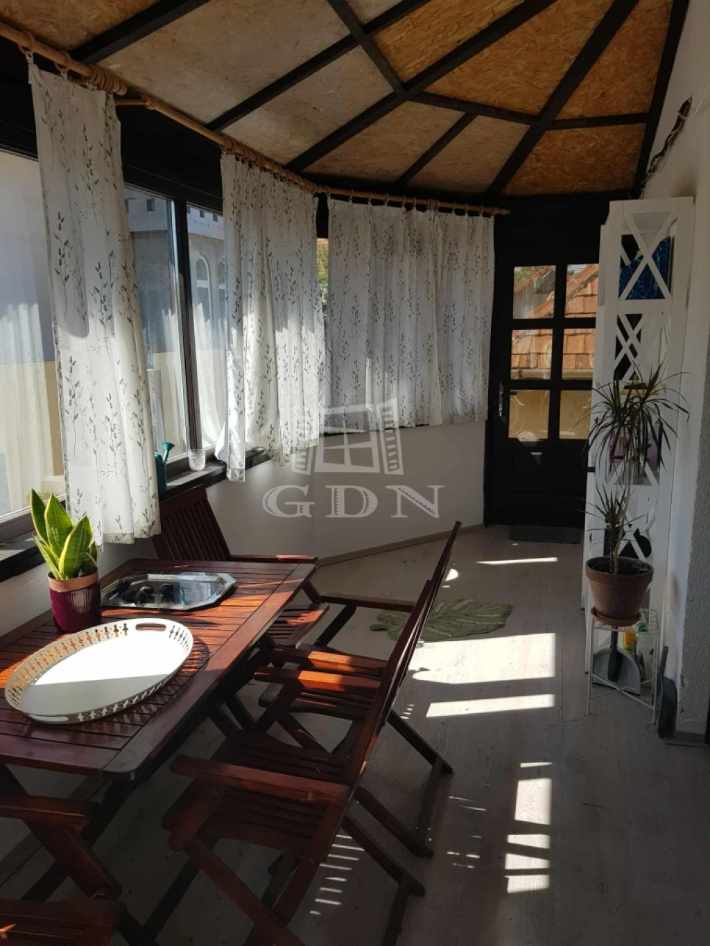 1 nagy nappali-etkező, tágas konyha, 2 haló, télikert fürdő és WC.