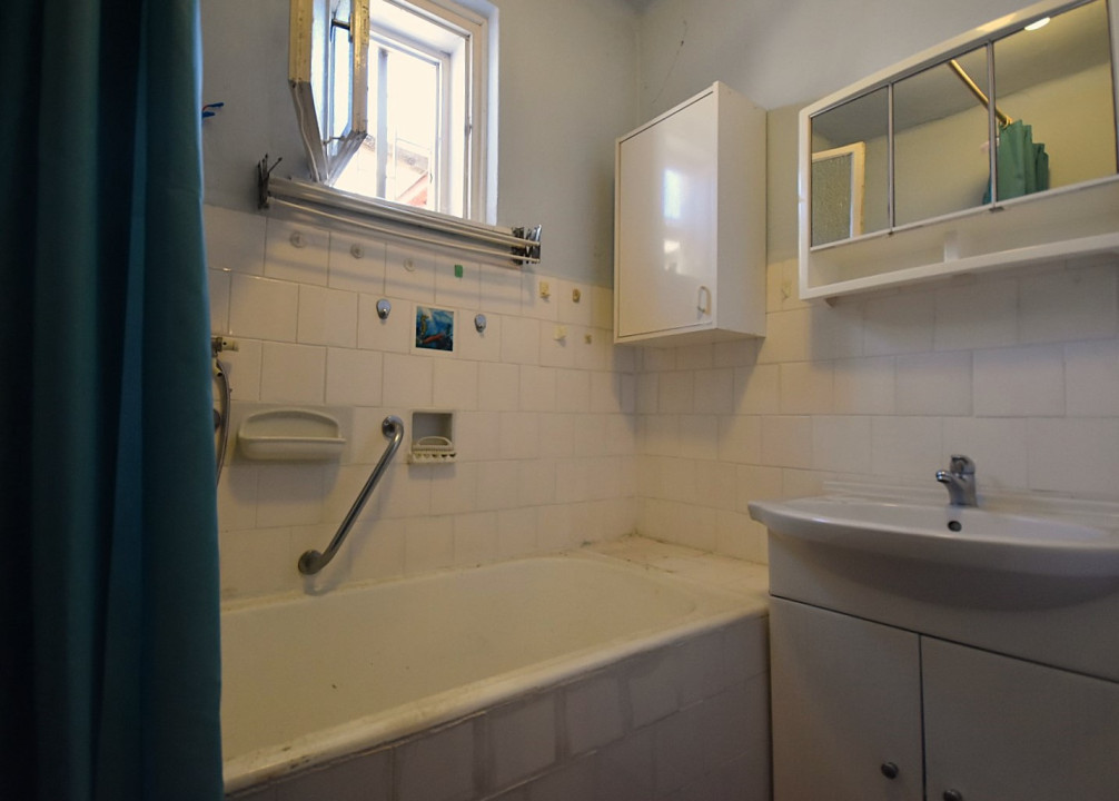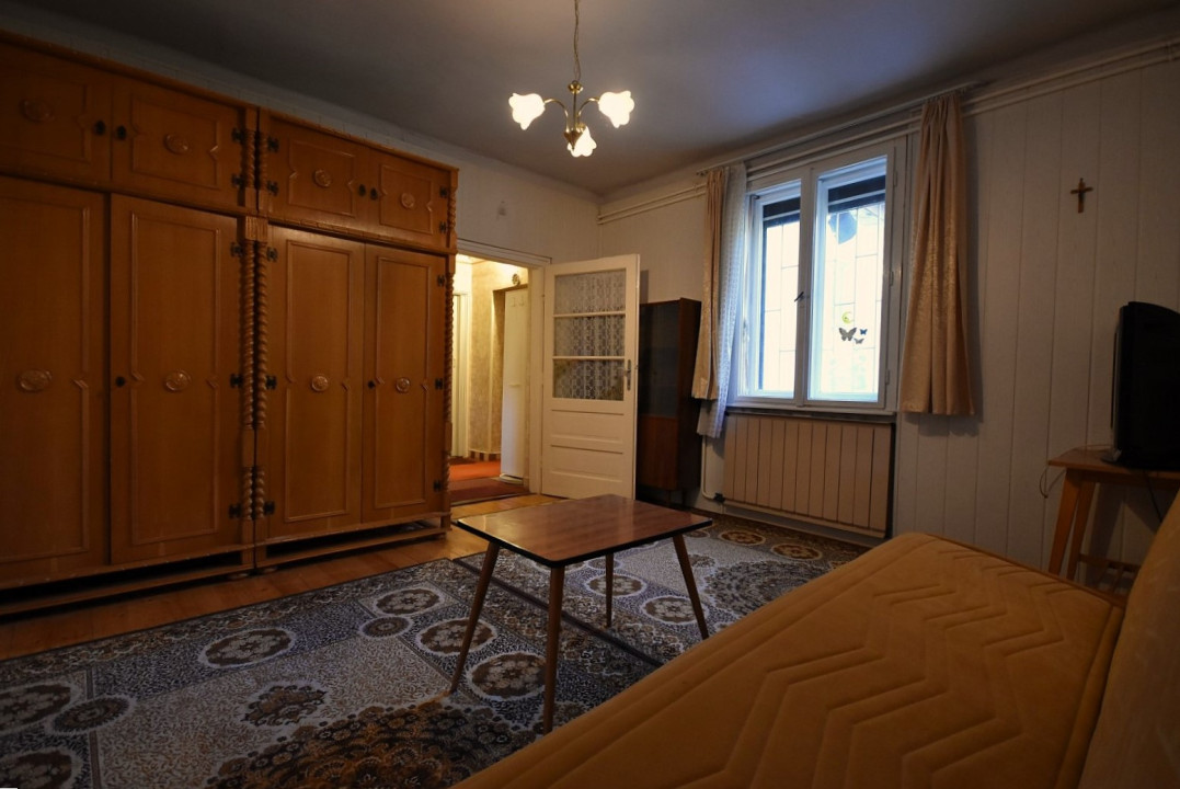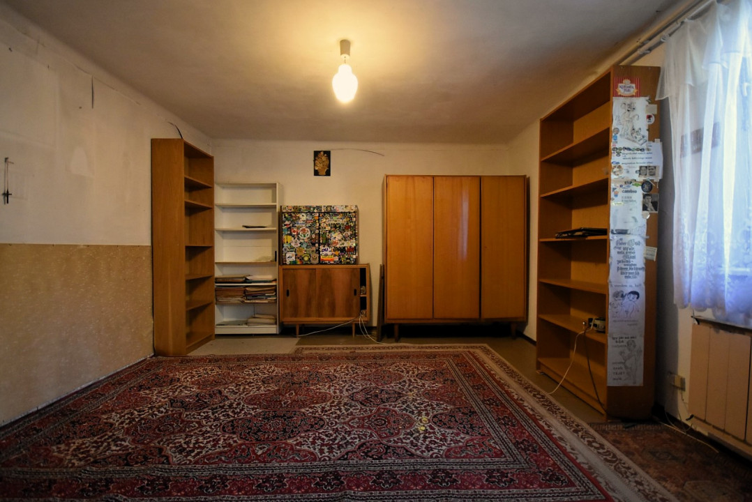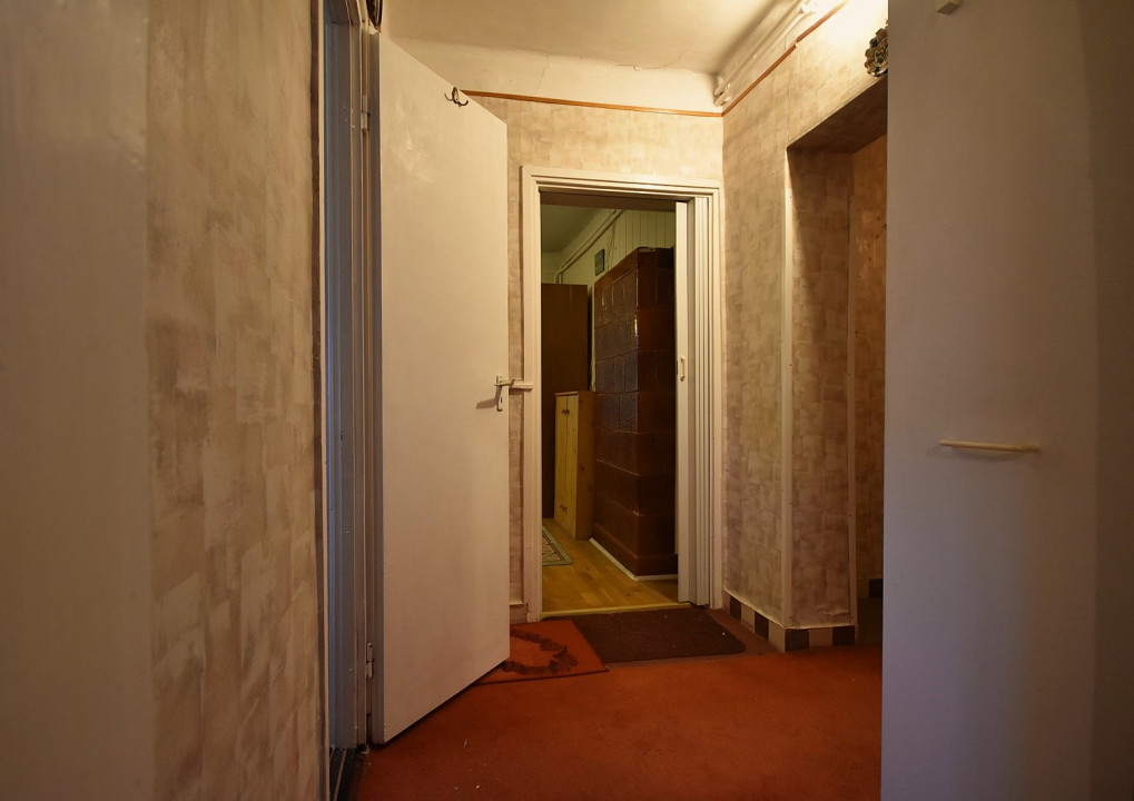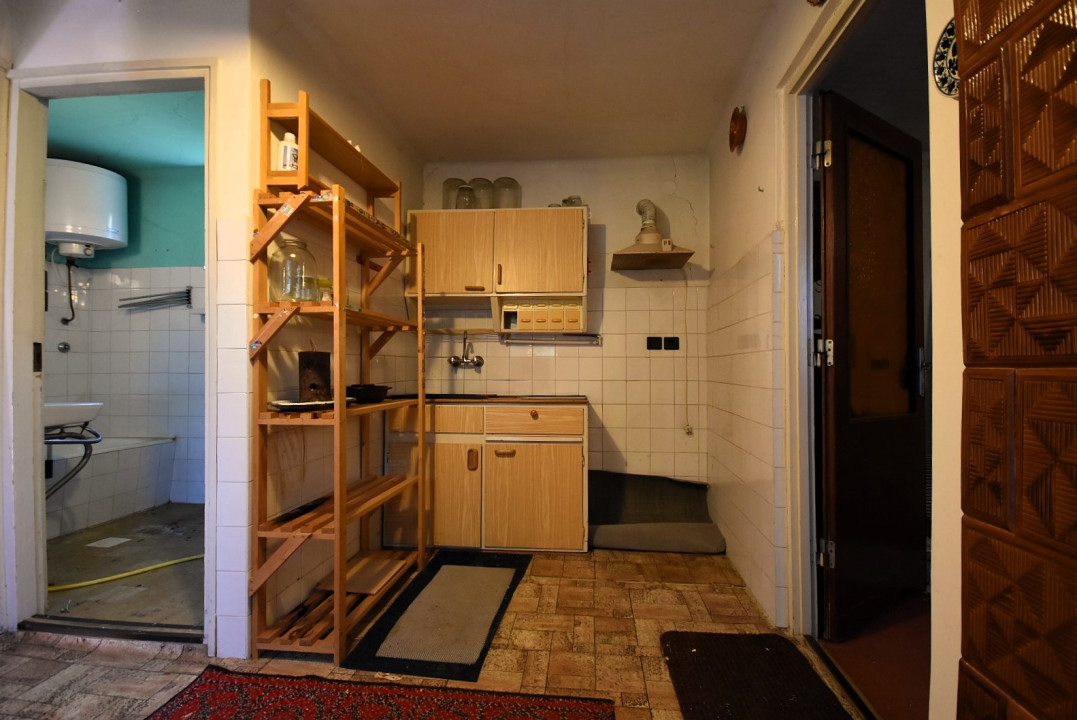A kisebb házrész pici előteréből nyílik a fürdőszoba, valamint a konyha. Innen tovább haladva jutunk be a szobába.