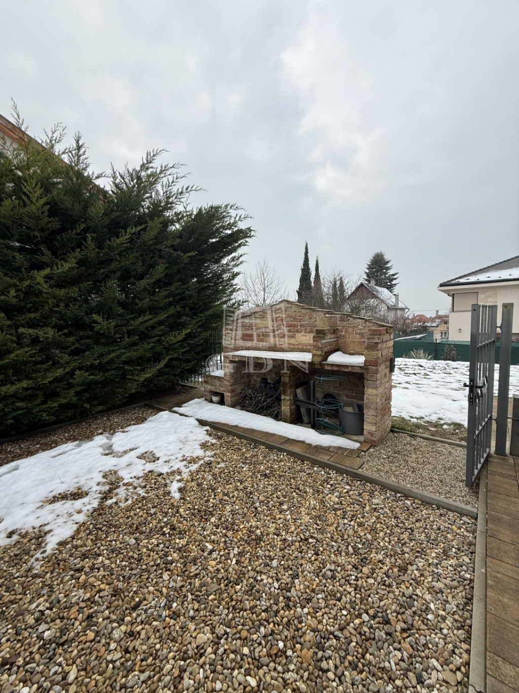 A szépen gondozott udvaron egy külön elkerített, hangulatos kerti sütögető rész került kialakításra – tökéletes helyszín családi és baráti összejövetelekhez.