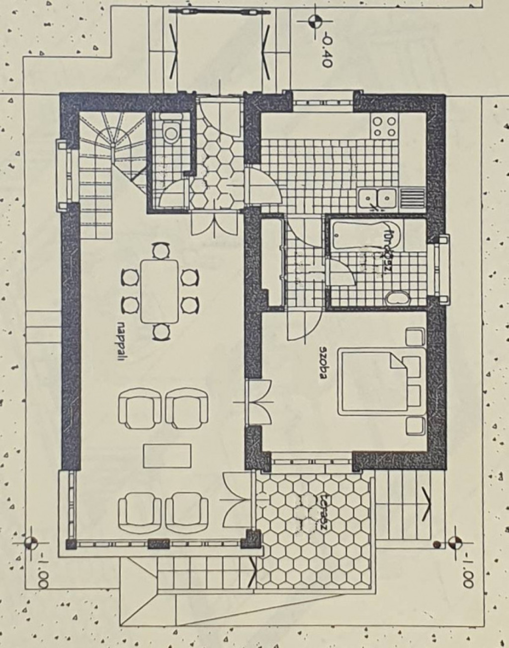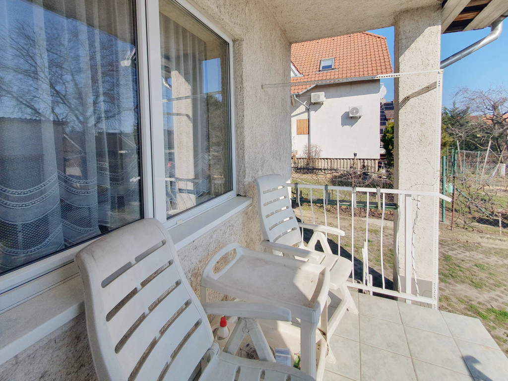 A 62 nm-es földszinten 2 bejárat. 29 nm-es nappali,12 nm-es hálószoba, ÉTKEZŐS, ABLAKOS KONYHA, közlekedő, előtér, kádas fürdőszoba és külön wc. 7 nm-es TERASZRA kijárat a nappaliból.