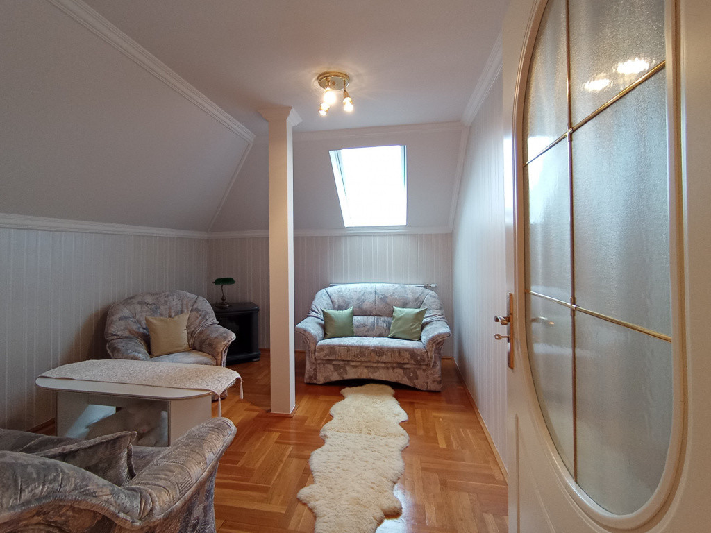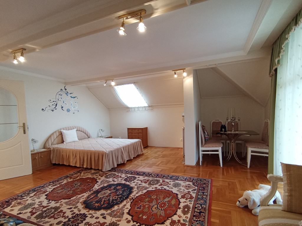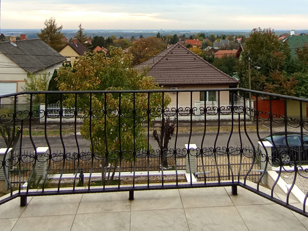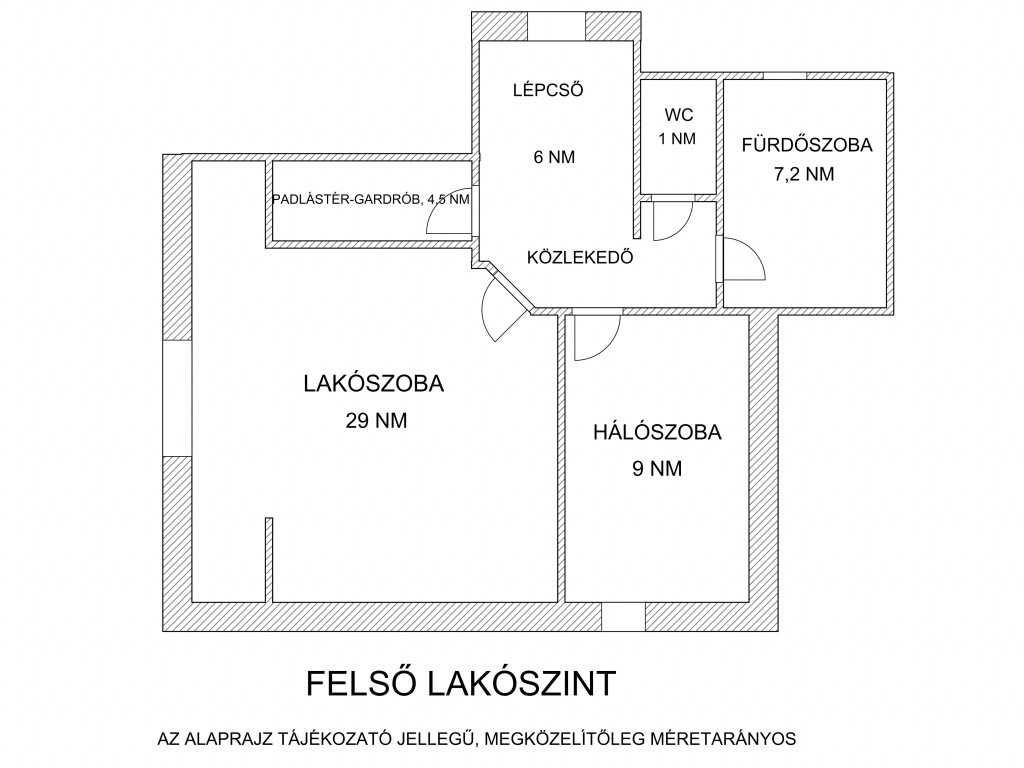 A felső szintre kényelmes épített lépcső vezet: a két szobán kívül fürdőszoba, külön WC, járható szekrényként használható, akár hobbiszobává alakítható pakolós padlástér kialakítású. A 29 nm-es szoba utcára néző, 12 nm-es erkélyéről páratlan kilátás nyílik a távoli Liszt Ferenc repülőtérre.