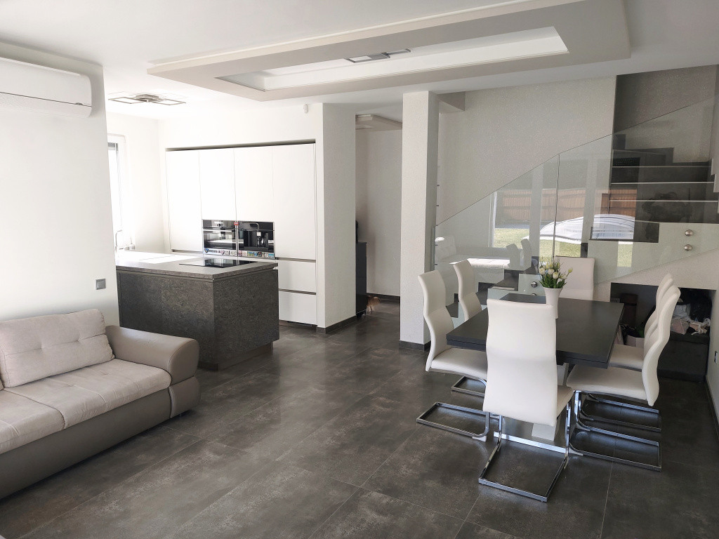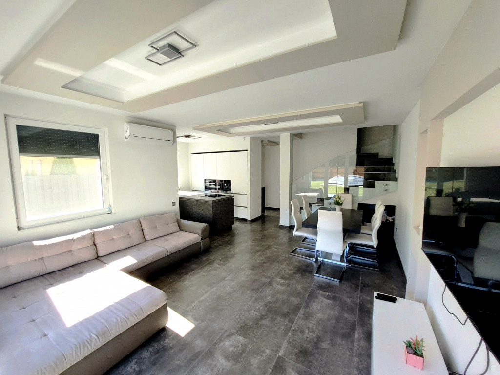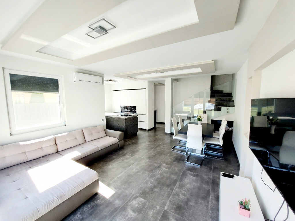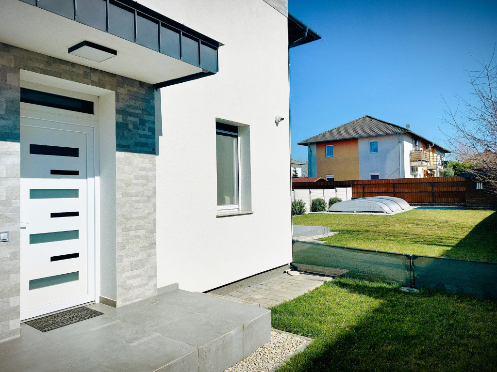A modern stílusú ikerház korszerű építési anyagokból MINŐSÉGI hő- és hangszigetelési technikával épült 2021-ben. Az energiatakarékos épület Porotherm téglából készült 12 cm-es homlokzati szigeteléssel, cserépfedéssel, műanyag hőszigetelt ablakokkal, melyek ELEKTROMOS ALUREDŐNYÖKKEL vannak felszerelve. A ház fűtését elektromos fűtési rendszer szolgáltatja, PADLÓFŰTÉSsel kialakítva. A megfelelő komfortérzetet mindkét szinten klímák biztosítják. Mindenhol minőségi burkolatok lettek lerakva, minőségi beltéri ajtók, mennyezeti lámpák melyek harmonizálnak egymással, így az egész házat egységes modern stílus és színvilág jellemez. A terek tágasak és világosak. A beépített XXX LUTZ-ban vásárolt prémium minőségű gépekkel felszerelt konyha szintén a vételár részét képezi.