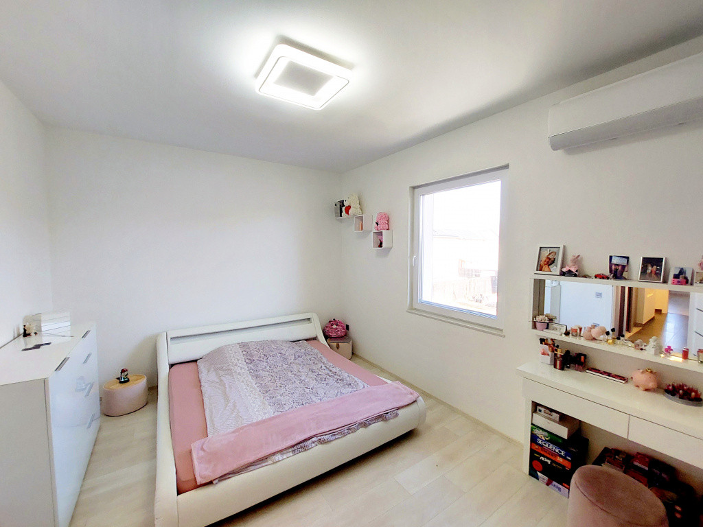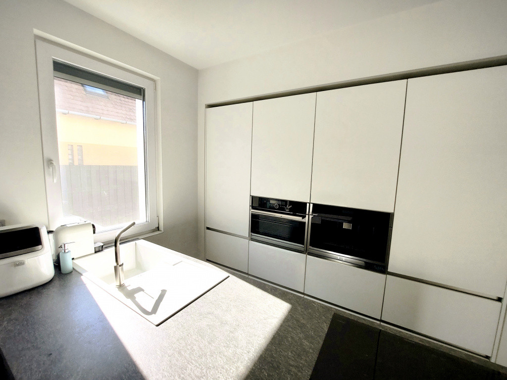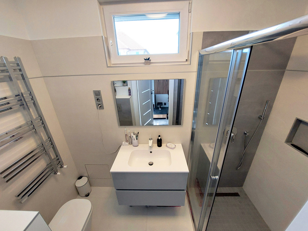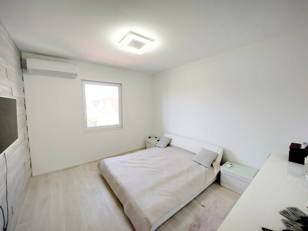 A modern stílusú ikerház korszerű építési anyagokból MINŐSÉGI hő- és hangszigetelési technikával épült 2021-ben. Az energiatakarékos épület Porotherm téglából készült 12 cm-es homlokzati szigeteléssel, cserépfedéssel, műanyag hőszigetelt ablakokkal, melyek ELEKTROMOS ALUREDŐNYÖKKEL vannak felszerelve. A ház fűtését elektromos fűtési rendszer szolgáltatja, PADLÓFŰTÉSsel kialakítva. A megfelelő komfortérzetet mindkét szinten klímák biztosítják. Mindenhol minőségi burkolatok lettek lerakva, minőségi beltéri ajtók, mennyezeti lámpák melyek harmonizálnak egymással, így az egész házat egységes modern stílus és színvilág jellemez. A terek tágasak és világosak. A beépített XXX LUTZ-ban vásárolt prémium minőségű gépekkel felszerelt konyha szintén a vételár részét képezi.