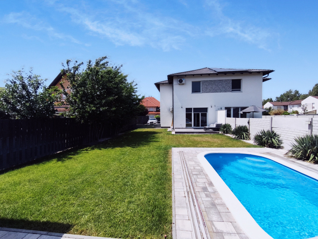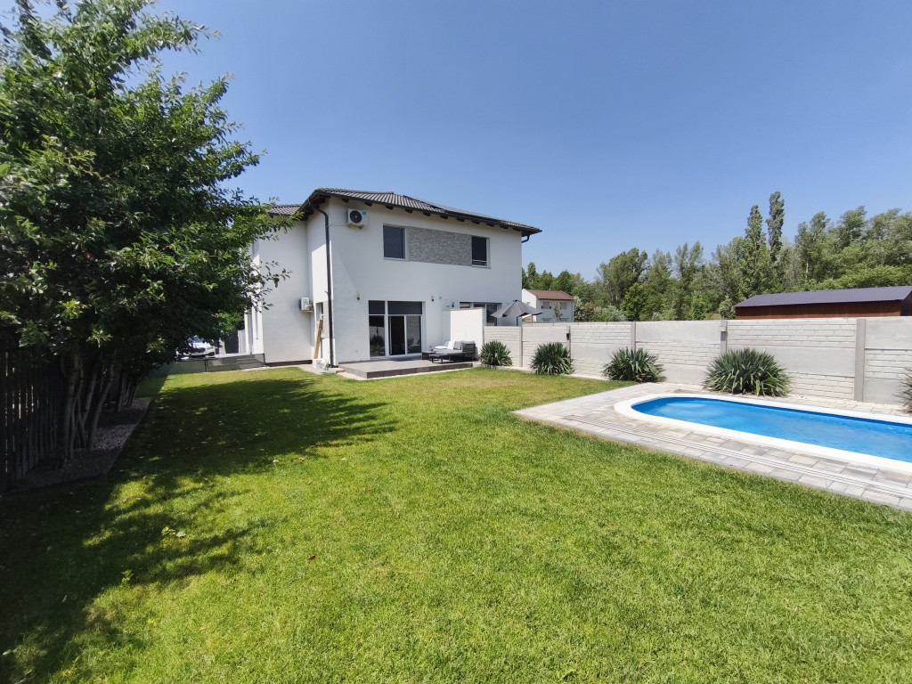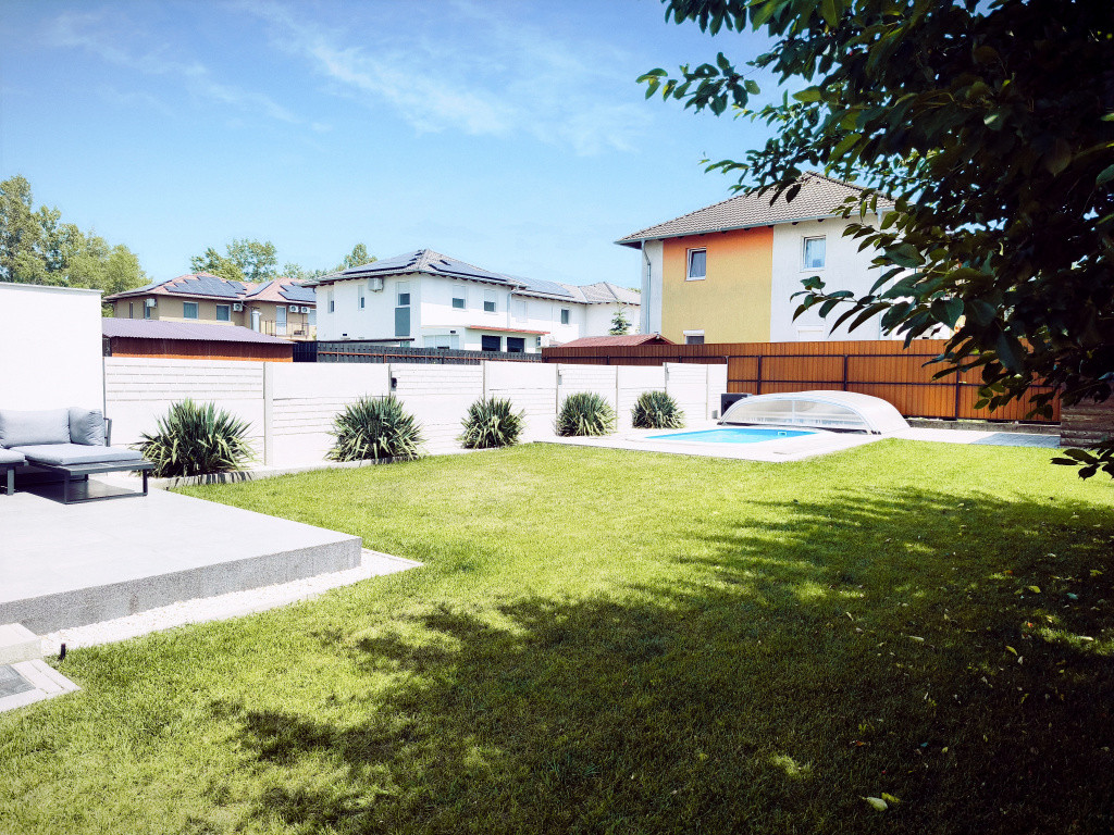 ÉPÍTETT MEDENCE is ki lett alakítva, mely minőségi és időjárásálló és ellenálló polikarbonát fedést kapott, mely nemcsak segít tartani a medence hőfokát, de biztonságos is a gyerekek és háziállatok szempontjából és nem utolsó sorban kiváló kültéri összhangot eredményez a kertben. A gondozott füvesített udvarban ÖNTÖZŐRENDSZER is kiépítésre került, a locsolást FÚRT KÚT biztosítja.
