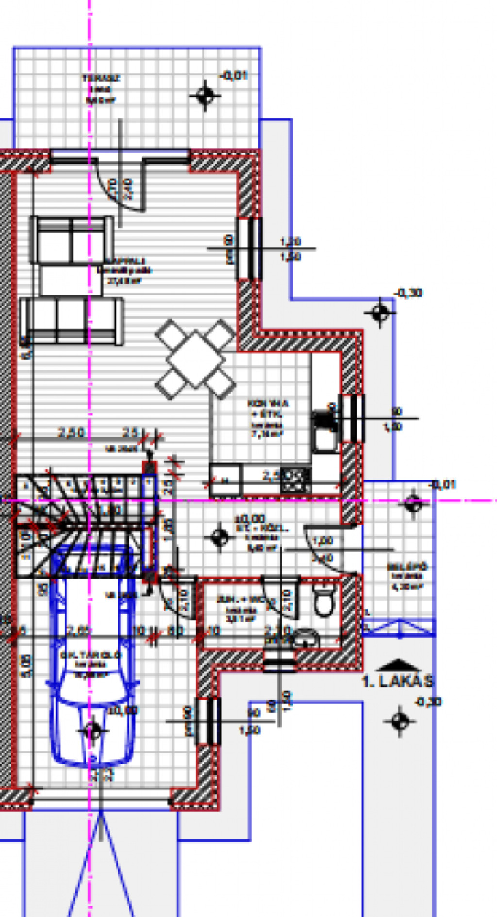 A FÖLDSZINT elrendezése a következő: tágas közlekedő, zuhanyzós fürdőszoba WC-vel, nappali-konyha-étkező, valamint egy jelenleg üzletnek használt helyiség, mely eredetileg garázsnak volt tervezve, de akár szobának is ki lehet alakítani az új tulajdonos igényei szerint. A nappaliból közelíthetjük meg a burkolt teraszt, mely tökéletes helyszínt nyújthat pihenésre vagy családi és baráti összejöveteleknek.