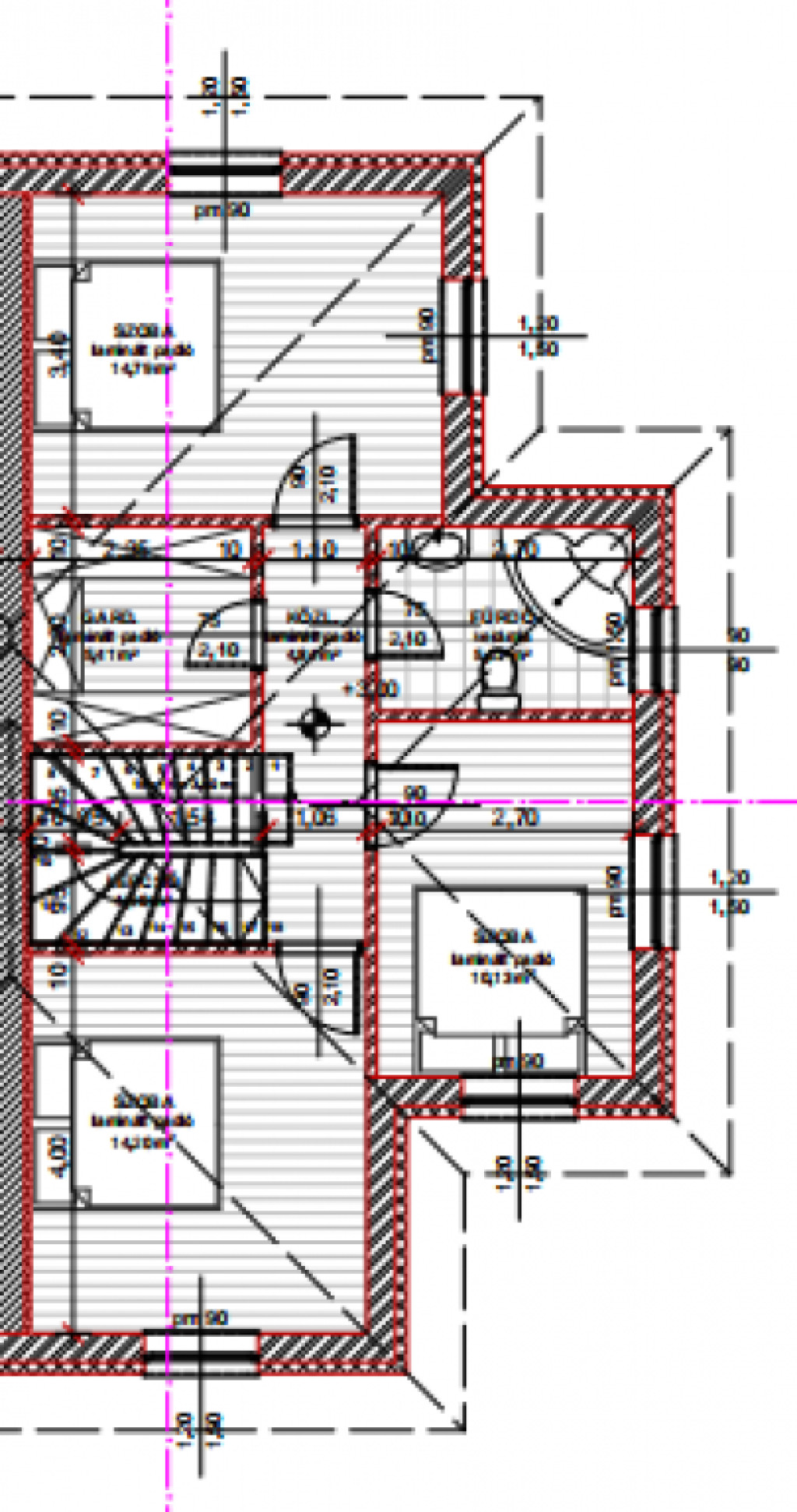Az EMELET kialakítása: középen kapott helyet egy kiválóan pakolható GARDRÓB (tágas, nyitott elrendezésű, de nagy kapacitású tárolós helyiség) három külön nyíló szoba és egy kádas fürdőszoba WC-vel. A legfontosabb tulajdonsága, hogy a felső szint NEM TETŐTÉRBEÉPÍTÉS, hanem rendes belmagasságú, teljes értékű felső szint, így nincsenek nyomasztó ferde falak.