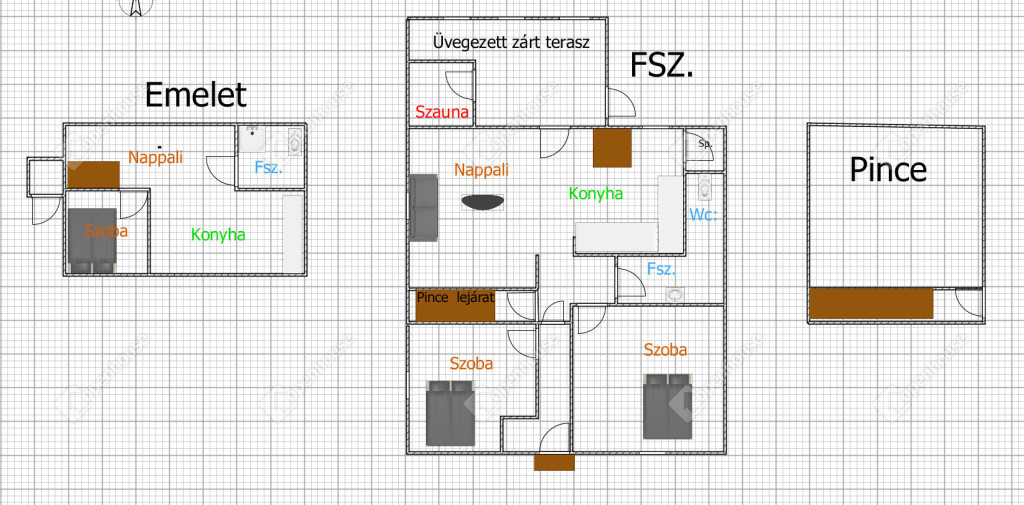 - fűtésrendrendszer: gázkazán (radiátoros hőleadás), kandalló