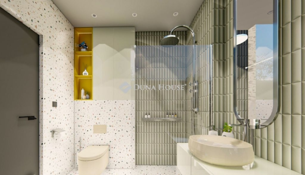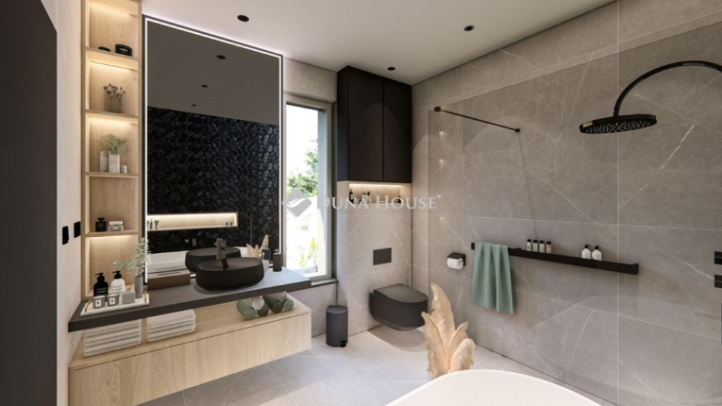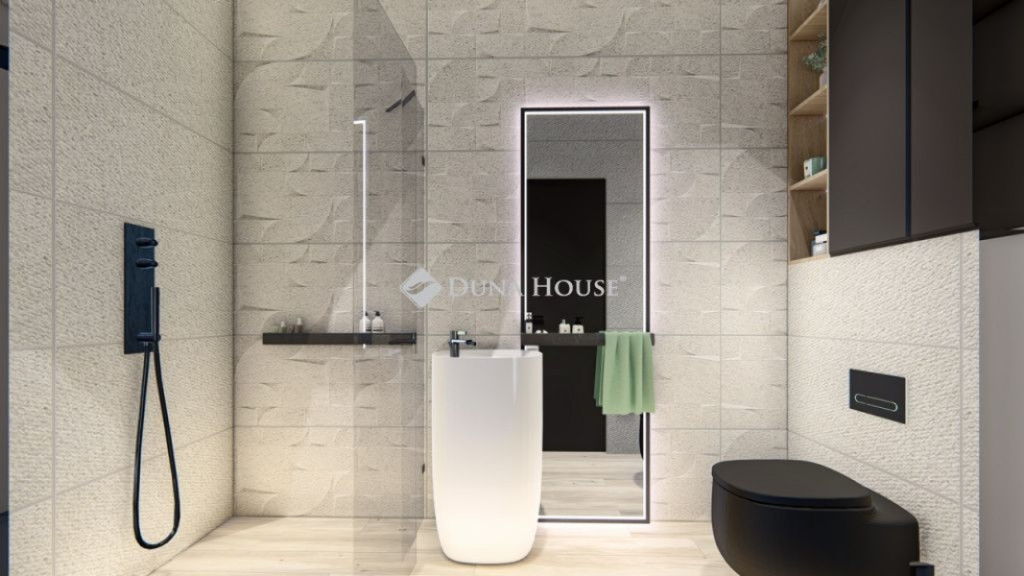 Épített zuhanykabin, ajtóval és rejtett zuhanylefolyókkal lesz kialakítva. A bútorokra felszerelhető porcelán szaniterek beépítésre kerülnek. A ház intelligens rendszerekkel felszerelt, ennek köszönhetően az alábbiak, akár telefonról is vezérelhetőek