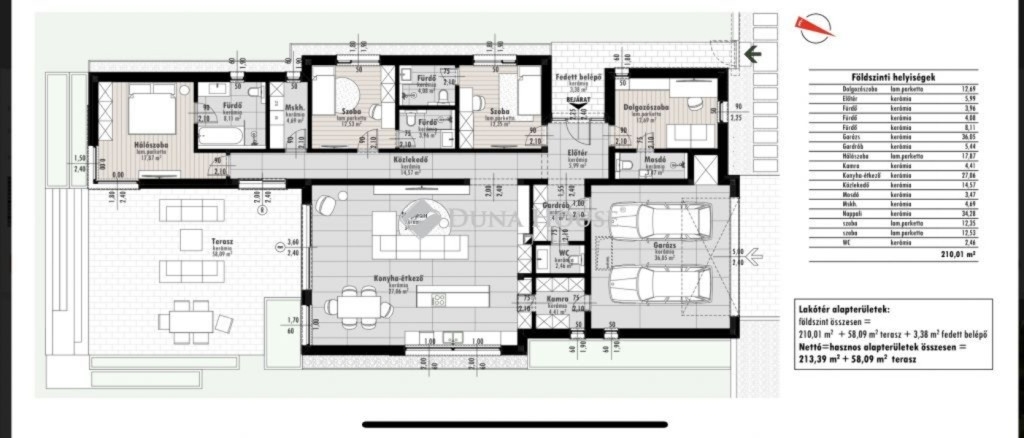Kiemelkedő hőszigetelési jellemzőkkel rendelkezik: a külső falakon 15 cm, míg a tetőn 25-30 cm vastagságú szigetelés gondoskodik a hőhatékonyságról. A megnövelt garázs (36 nm) két autó számára biztosít fűtött parkolóhelyet.