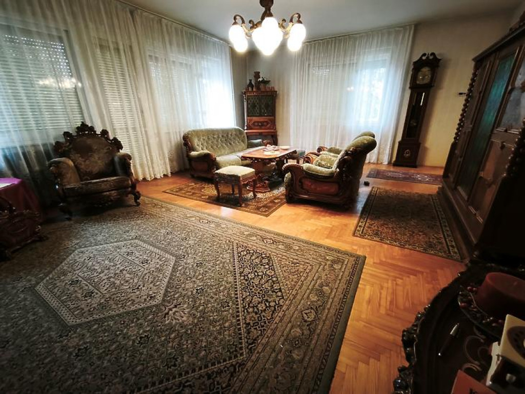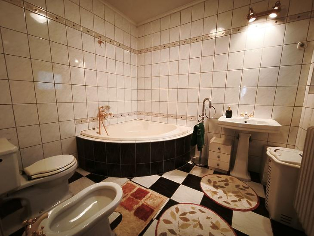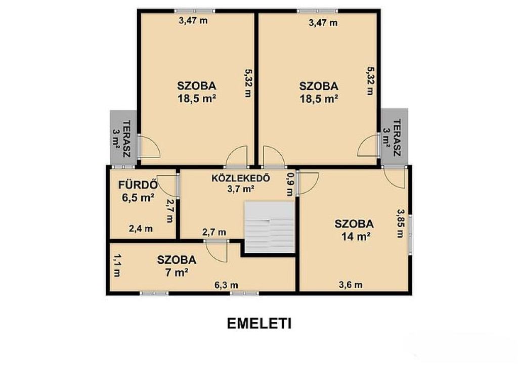 Emelet: 4 szoba, fürdőszoba + mellékhelyiség, közlekedő, 2 erkély.