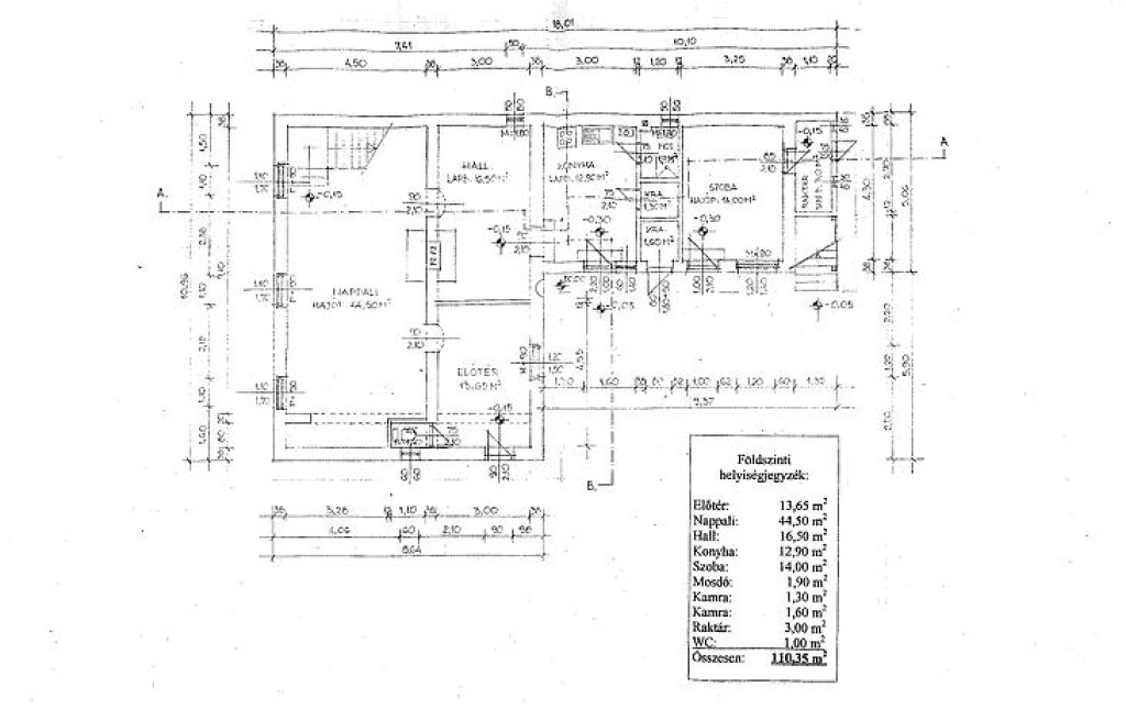 Földszint: Előszoba, hall, nappali, konyha + étkező, kádas fürdőszoba, 2 wc, 2 kamra, előtér, raktár.
