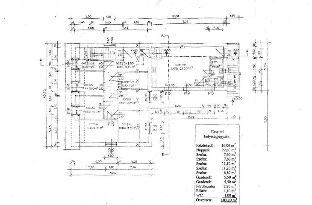 Emelet: 5 szoba, nappali, fürdőszoba, wc, 2 gardrób, előtér, közlekedő.
