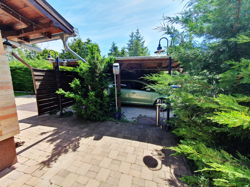 Látható elegáns fa födém. Zsindelyfedés. Mennyezeti LED és díszvilágítás, Kamera rendszer, OKOS OTTHON. Eszközök többsége telefonos applikációból vezérelhető. Távműködtetésú úszókapuk, egy autó beállási lehetőség a zárt udvarra. Ez bővíthető. FEDETT FELSZÍNI PARKOLÓ. Épített gyermekjátszótér. Kovácsoltvas kerítés két személykapuval. 10 nm-es KERTI TÁROLÓ. 25 nm-es klimatizált, MŰHELYNEK. 380 V, 6 kWh NAPELEM, 3*25 V és1*32 V. Kerti lámpák.
