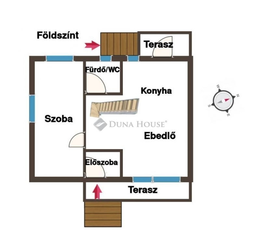 Földszint: Tágas, 28 nm-es világos nappali, étkező, és egy kertkapcsolatos konyha, valamint egy kádas fürdőszoba WC-vel.