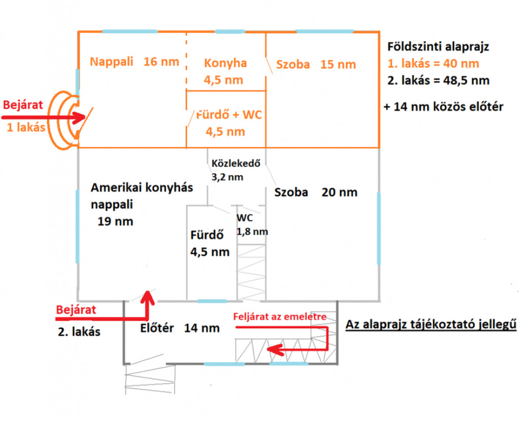 1. lakás: földszinten, 40 nm-es, kétszobás, fürdő-WC egyben, gázkonvektor fűtés