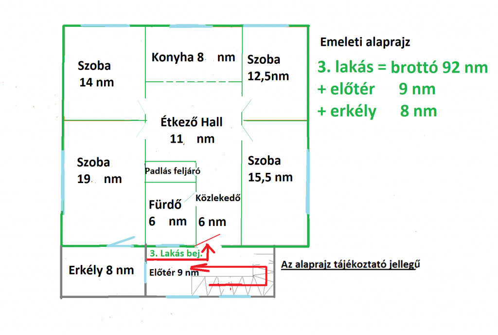 3. lakás: emeleten, bruttó 92 nm, 4 szoba, amerikai konyhás nappali, fürdő-WC egyben, 8 nm-es erkély, padló fűtés. Ez az emeleti lakás méretének köszönhetően szintén megosztható két különálló lakásra.