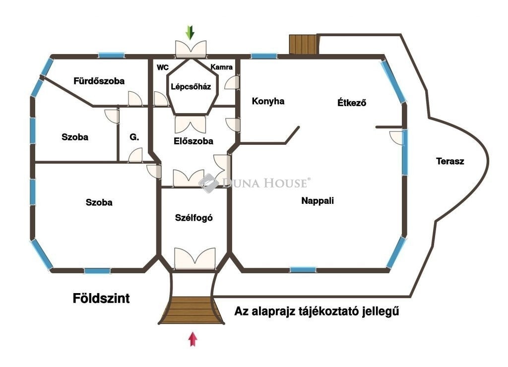 Földszinten egy hatalmas amerikai konyhás nappali, teraszkapcsolattal, 2 hálószoba, gardrób, fürdőszoba sarokkáddal és külön WC kapott helyet.