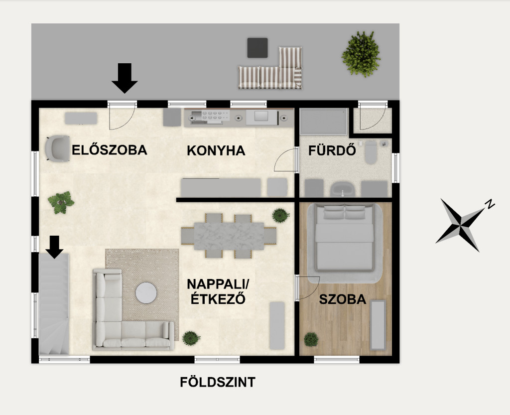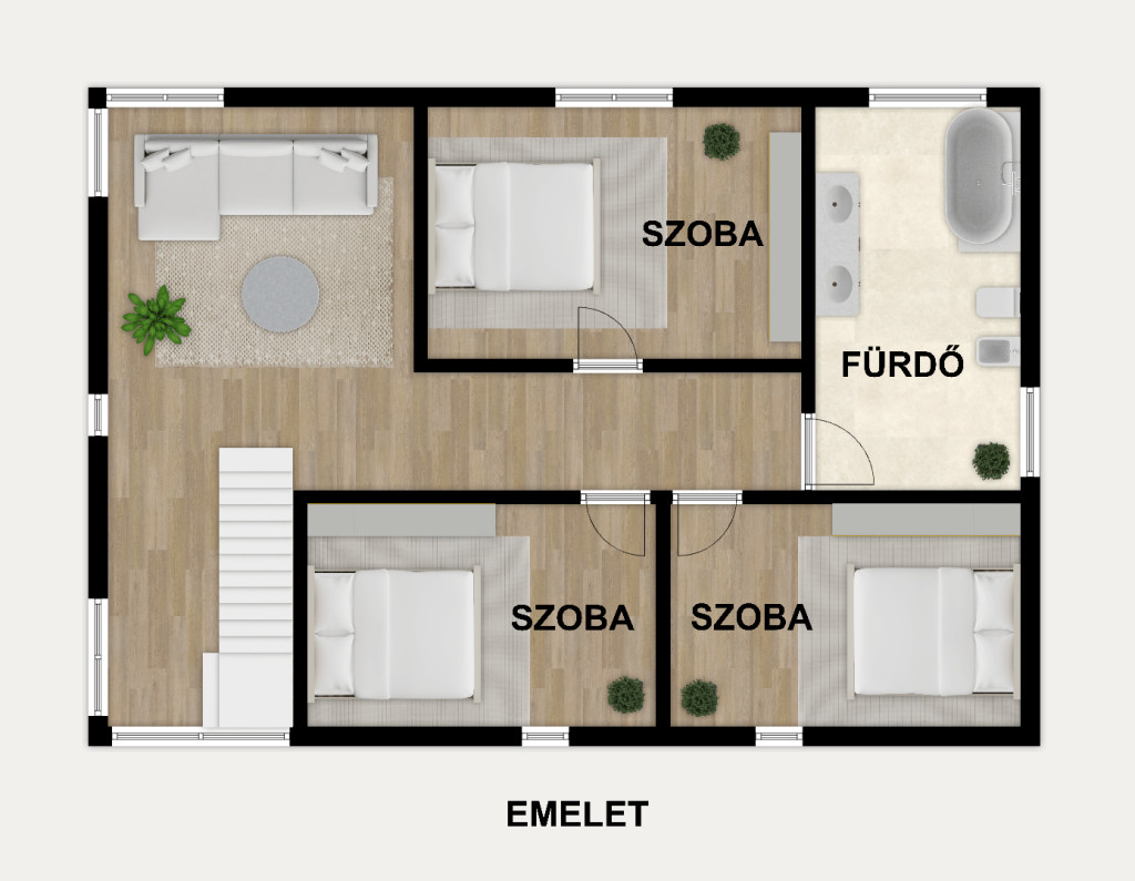 A 2 szintes házat tágas, napfényes terek és átgondolt tervezés jellemzi. Földszintjén amerikai konyhás nappali, közvetlen kert- és teraszkapcsolattal, hálószoba, fürdő, és gépészeti helyiség található. Az emeleten 3 hálószoba, fürdő és egy külön nappali kapott helyet, a padlástér pedig tárolásra lett kialakítva.