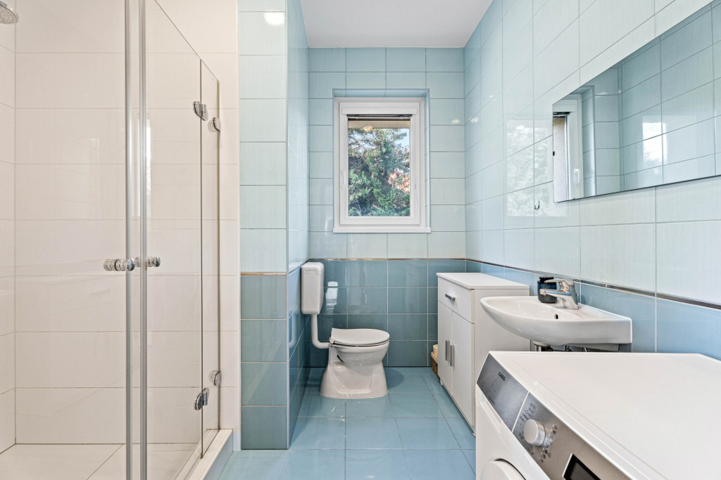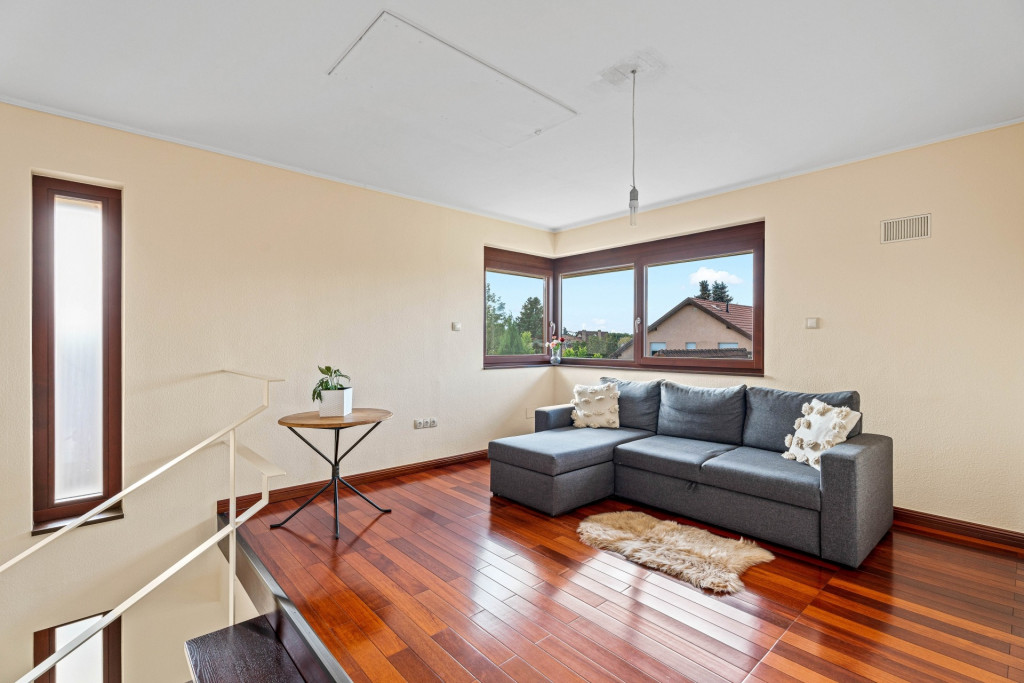 The 2-story house is characterized by spacious, sunny spaces and thoughtful design. The ground floor features a living room, kitchen, dining room, direct garden and terrace connection, one bedroom, a bathroom and utility room. On the first floor there are 3 bedrooms, a bathroom and a living room. The attic space was designed for storage.